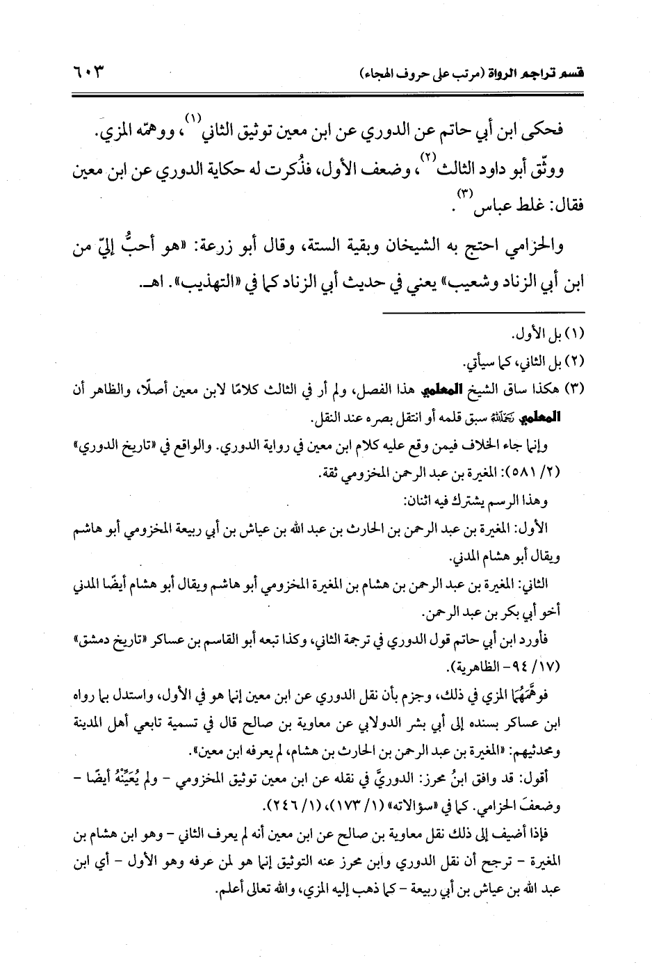 فوهَّمَهُمَا المزي في ذلك، وجزم بأن نقل الدوري عن ابن معين إنا هو في الأول، واستدل بما رواه ابن عساكر بسنده إلى أبي بشر الدولابي عن معاوية بن صالح قال في تسمية تابعي أهل المدينة ومحدثيهم: "المغيرة بن عبد الرحمن بن الحارث بن هشام، لم يعرفه ابن معين".