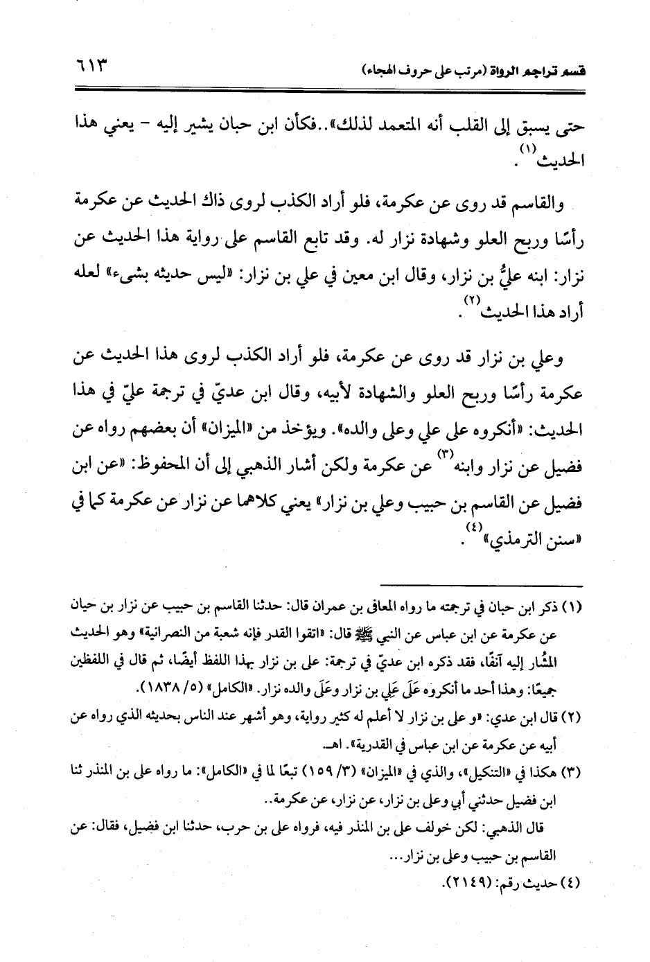 والقاسم قد روى عن عكرمة، فلو أراد الكذب لروى ذاك الحديث عن عكرمة رأسًا وربح العلو وشهادة نزار له. وقد تابع القاسم على رواية هذا الحديث عن نزار: ابنه عليُّ بن نزار، وقال ابن معين في علي بن نزار: "ليس حديثه بشيء" لعله أراد هذا الحديث (¬2).
