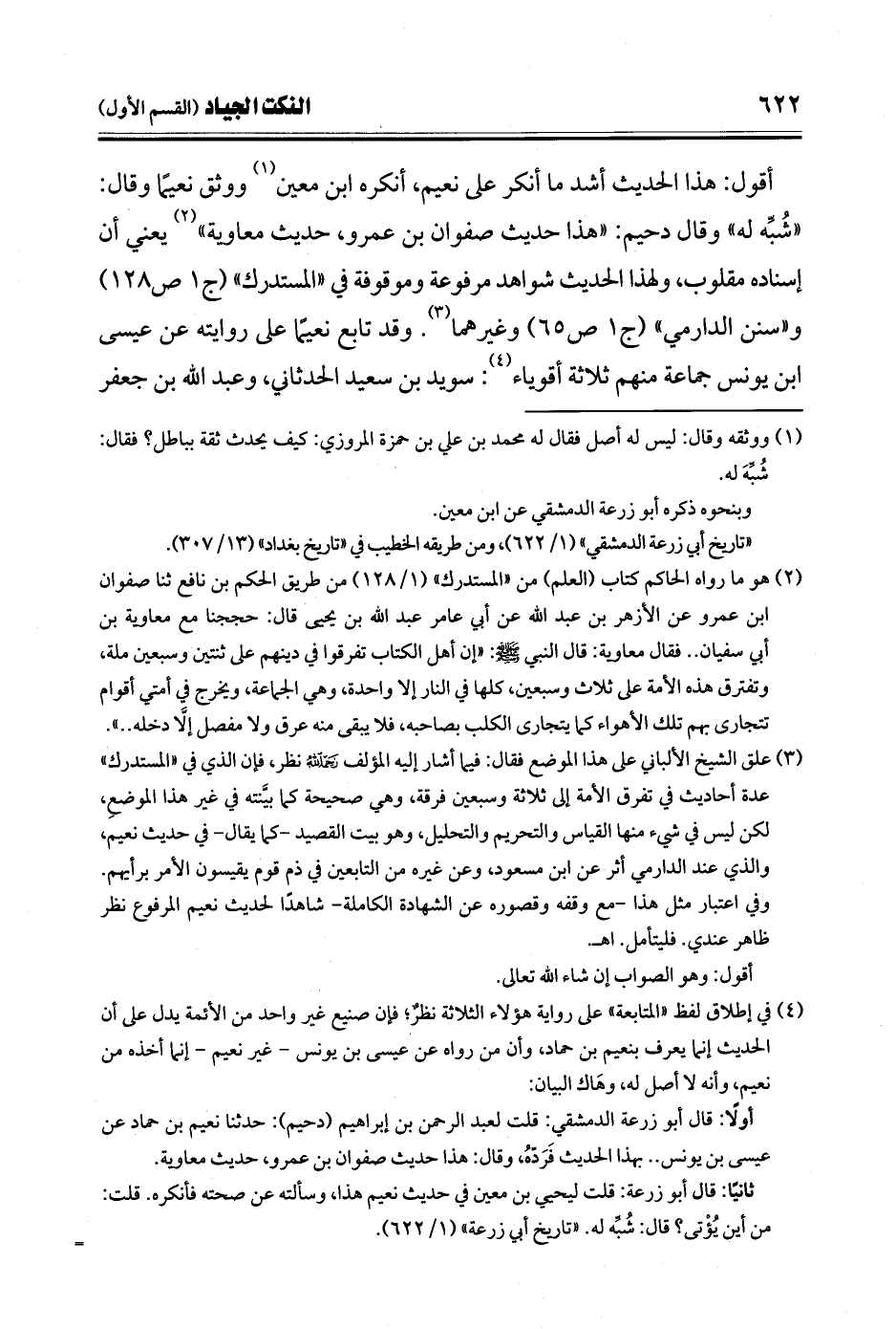 أقول: هذا الحديث أشد ما أنكر على نعيم، أنكره ابن معين (¬1) ووثق نعيمًا وقال: "شُبِّه له" وقال دحيم: "هذا حديث صفوان بن عمرو، حديث معاوية" (¬2) يعني أن إسناده مقلوب ولهذا الحديث شواهد مرفوعة وموقوفة في "المستدرك" (ج 1 ص 128) و"سنن الدارمي" (ج 1 ص 65) وغيرهما (¬3). وقد تابع نعيمًا على روايته عن عيسى ابن يونس جماعة منهم ثلاثة أقوياء (¬4): سويد بن سعيد الحدثاني، وعبد الله بن جعفر