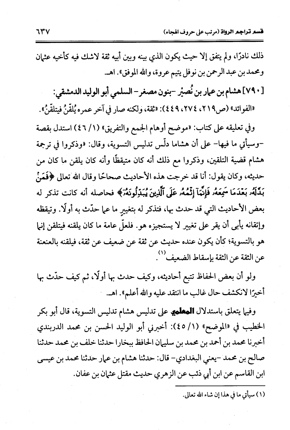 وفيما يتعلق باستدلال المعلمي على تدليس هشام تدليس التسوية, قال أبو بكر الخطيب في "الموضح" (1/ 45): أخبرني أبو الوليد الحسن بن محمد الدربندي أخبرنا محمد بن أحمد بن محمد بن سليمان الحافظ ببخارا حدثنا خلف بن محمد حدثنا صالح بن محمد -يعني البغدادي- قال: حدثنا هشام بن عمار حدثنا محمد بن عيسى ابن القاسم عن ابن أبي ذئب عن الزهري حديث مقتل عثمان بن عفان.