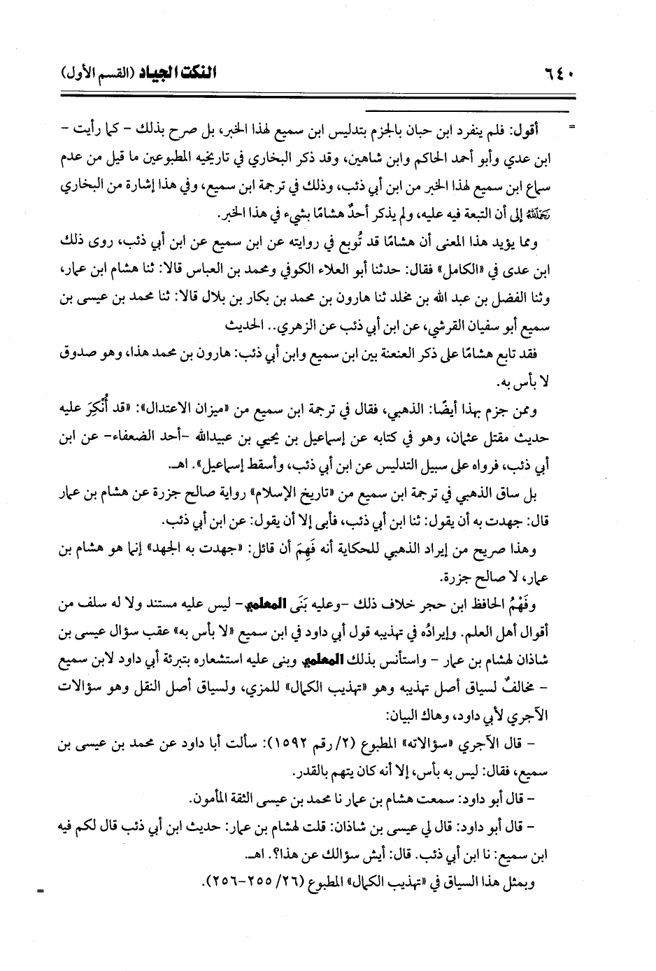 وفَهْمُ الحافظ ابن حجر خلاف ذلك -وعليه بَنَى المعلمي- ليس عليه مستند ولا له سلف من أقوال أهل العلم. وإيرادُه في تهذيبه قول أبي داود في ابن سميع "لا بأس به" عقب سؤال عيسى بن شاذان لهشام بن عمار -واستأنس بذلك المعلمي وبنى عليه استشعاره بتبرئة أبي داود لابن سميع- مخالفٌ لسياق أصل تهذيبه وهو "تهذيب الكمال" للمزي، ولسياق أصل النقل وهو سؤالات الآجري لأبي داود، وهاك البيان: