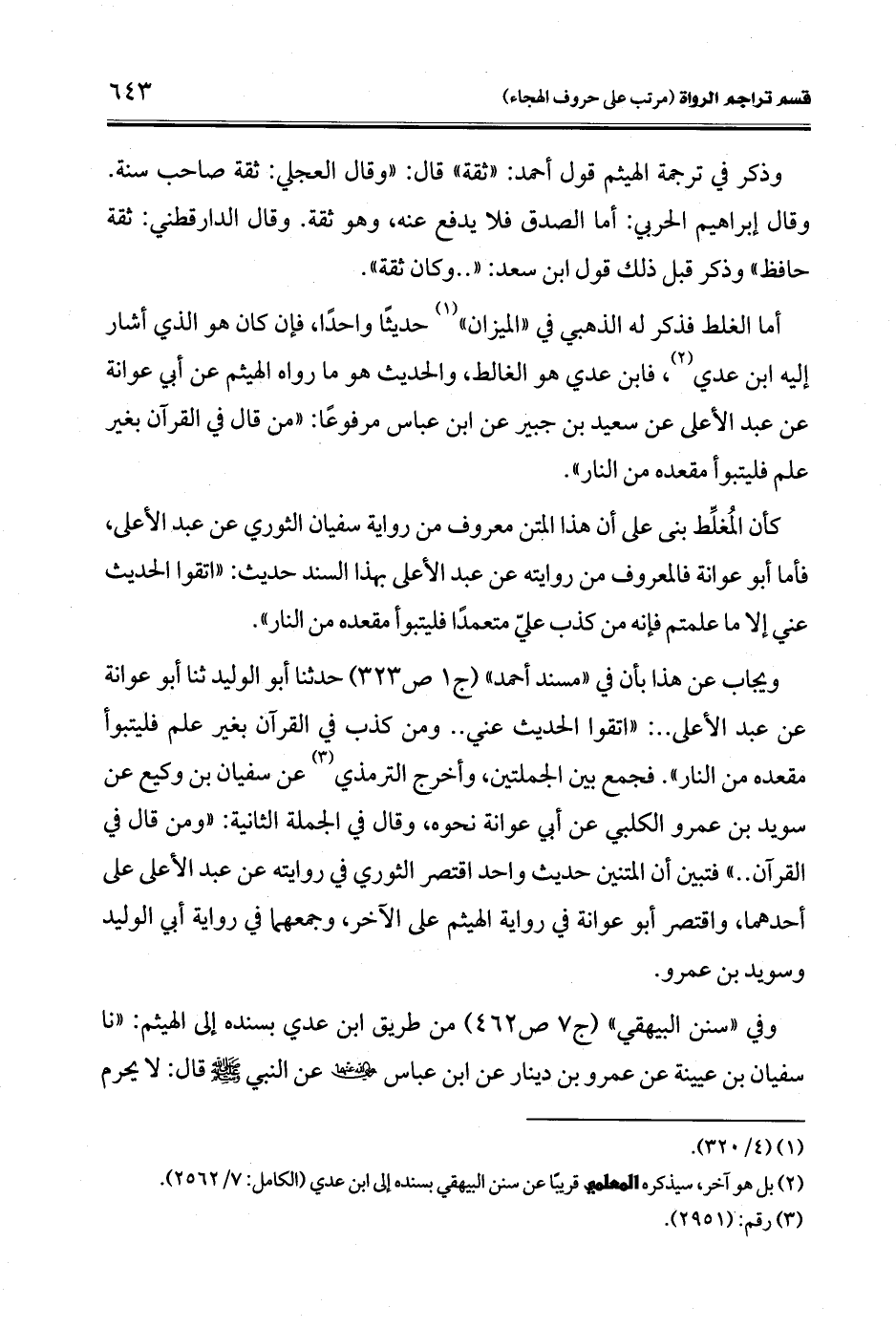 أما الغلط فذكر له الذهبي في "الميزان" (¬1) حديثًا واحدًا، فإن كان هو الذي أشار إليه ابن عدي (¬2)، فابن عدي هو الغالط، والحديث هو ما رواه الهيثم عن أبي عوانة عن عبد الأعلى عن سعيد بن جبير عن ابن عباس مرفوعًا: "من قال في القرآن بغير علم فليتبوأ مقعده من النار".