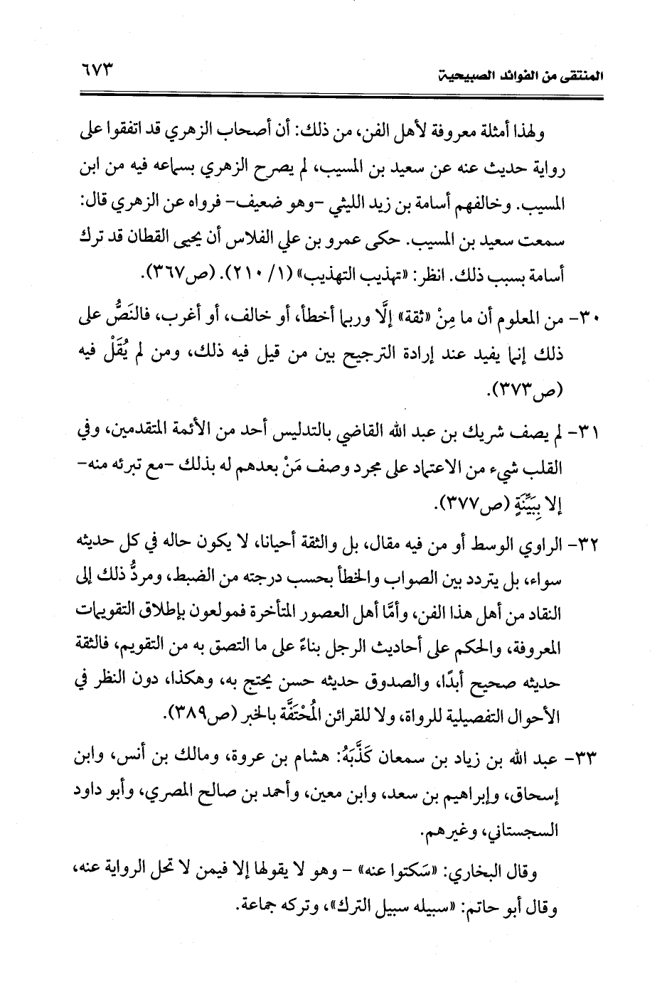 30 - من المعلوم أن ما مِنْ "ثقة" إلا وربما أخطأ، أو خالف، أو أغرب، فالنَصُّ على ذلك إنما يفيد عند إرادة الترجيح بين من قيل فيه ذلك، ومن لم يُقَلْ فيه (ص 373).