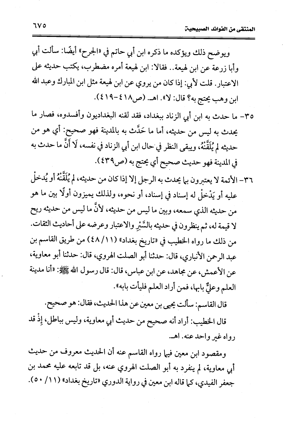 35 - ما حدث به ابن أبي الزناد ببغداد، فقد لقنه البغداديون وأفسدوه فصار ما يحدث به ليس من حديثه، أما ما حَدَّث به بالمدينة فهو صحيح: أي هو من حديثه لم يُلَقَّنْهُ، ويبقى النظر في حال ابن أبي الزناد في نفسه، لَا أَنَّ ما حدث به في المدينة فهو حديث صجيح أي يحتج به (ص 439).