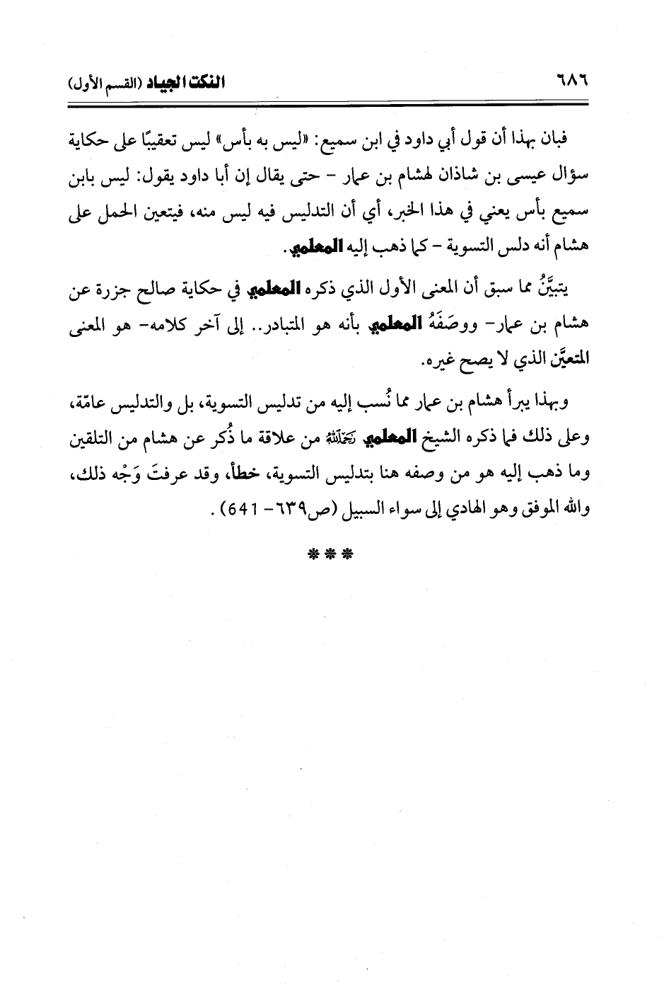 فبان بهذا أن قول أبي داود في ابن سميع: "ليس به بأس" ليس تعقيبًا على حكاية سؤال عيسى بن شاذان لهشام بن عمار -حتى يقال إن أبا داود يقول: ليس بابن سميع بأس يعني في هذا الخبر، أي أن التدليس فيه ليس منه، فيتعين الحمل على هشام أنه دلس التسوية- كما ذهب إليه المعلمي.