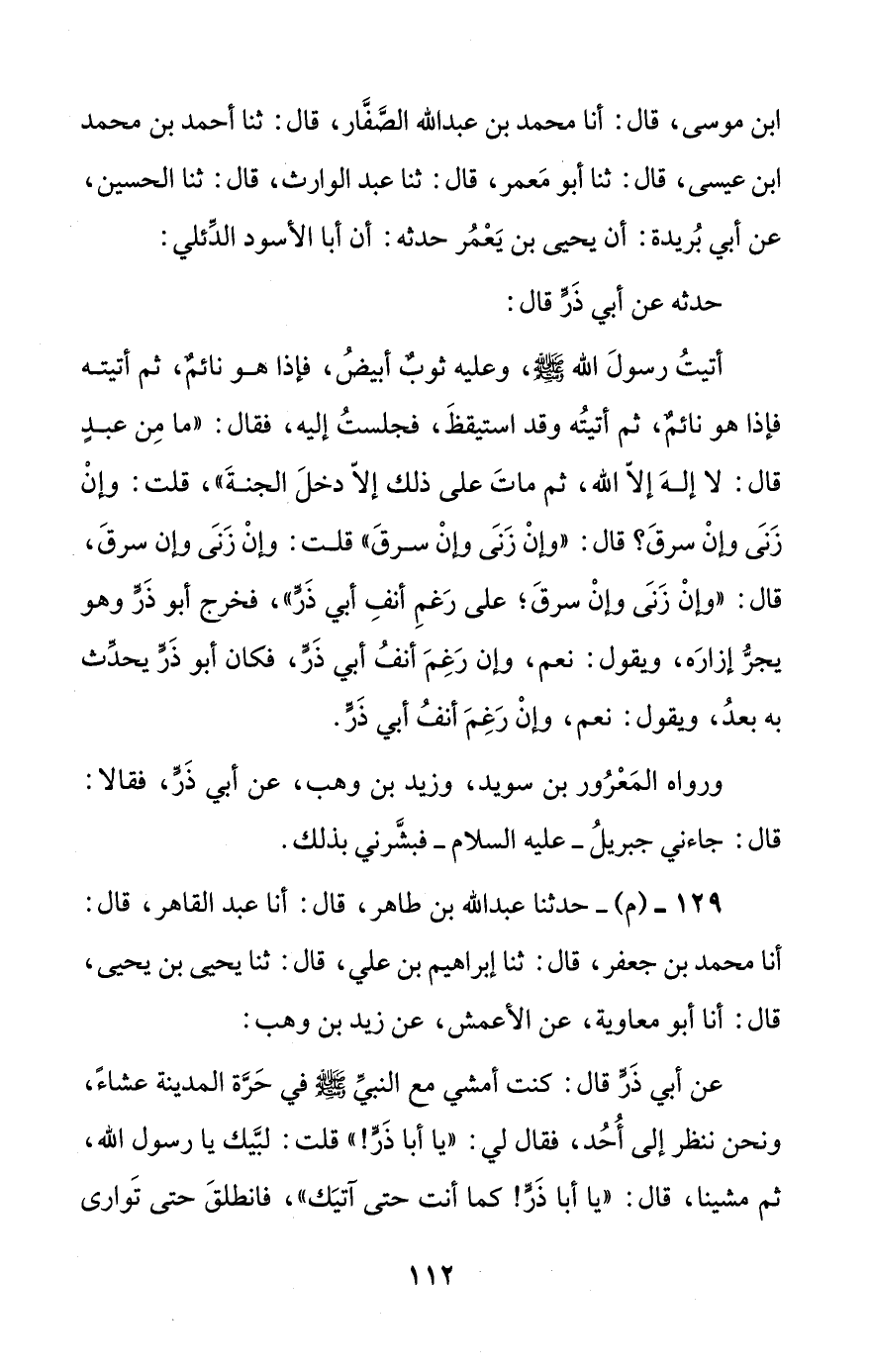 129 - (م) - حدثنا عبد الله بن طاهر، قال: أنا عبد القاهر، قال: أنا محمد بن جعفر، قال: ثنا إبراهيم بن علي، قال: ثنا يحيى بن يحيى، قال: أنا أبو معاوية، عن الأعمش، عن زيد بن وهب: