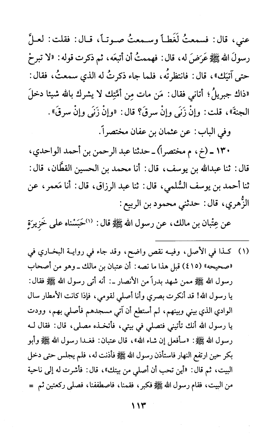 130 - (خ، م مختصرا) - حدثنا عبد الرحمن بن أحمد الواحدي، قال: ثنا عبد الله بن يوسف، قال: أنا محمد بن الحسين القطان، قال: ثنا أحمد بن يوسف السلمي، قال: ثنا عبد الرزاق، قال: أنا معمر، عن الزهري، قال: حدثني محمود بن الربيع: عن عتبان بن مالك، عن رسول الله صلى الله عليه وسلم قال: (¬1) حبسناه على خزيرة #114# صنعنا له، فدخل علي – أو قال: ثاب- الناس، فاجتمعوا، وسمع به أهل الدار -يعني أهل القرية-، فثابوا حتى امتلأ البيت، فقال رجل: أين مالك بن الدخشن -أو الدخيشن-؟ فقال رجل: إن ذاك رجل منافق، لا يحب الله ولا رسوله، فقال النبي صلى الله عليه وسلم: ((لا تقله، هو يقول: لا إله إلا الله يبتغي بذلك وجه الله))، فقالوا: أما نحن فنرى وجهه إلى المنافقين، فقال النبي صلى الله عليه وسلم: ((لا تقولوا، وهو يقول: لا إله إلا الله يبتغي بذلك وجه الله))، قال: نعم، قال: ((لن يوافي عبد يوم القيامة، وهو يقول: لا إله إلا الله، يبتغي بذلك وجه الله إلا حرم على النار)).
