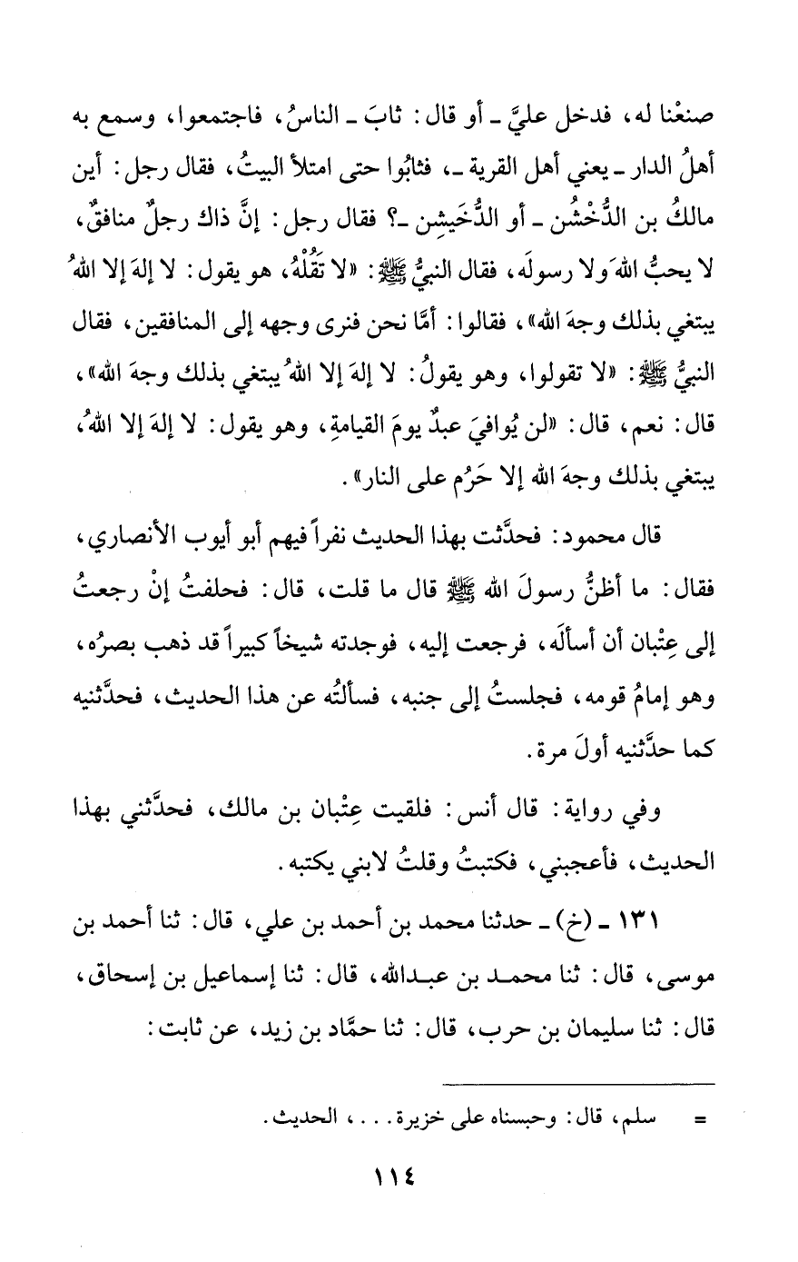 131 - (خ) - حدثنا محمد بن أحمد بن علي، قال: ثنا أحمد بن موسى، قال: ثنا محمد بن عبد الله، قال: ثنا إسماعيل بن إسحاق، قال: ثنا سليمان بن حرب، قال: ثنا حماد بن زيد، عن ثابت: #115# عن أنس: أن غلاما من اليهود كان يخدم النبي صلى الله عليه وسلم، فمرض، فأتاه النبي صلى الله عليه وسلم يعوده، فقعد عند رأسه، فقال له النبي صلى الله عليه وسلم: ((أسلم))، فنظر إلى أبيه وهو عند رأسه، فقال له: أطع أبا القاسم، فشهد أن لا إله إلا الله وأن محمدا رسول الله، فخرج النبي صلى الله عليه وسلم وهو يقول: ((الحمد لله الذي أنقذه بي من النار)).