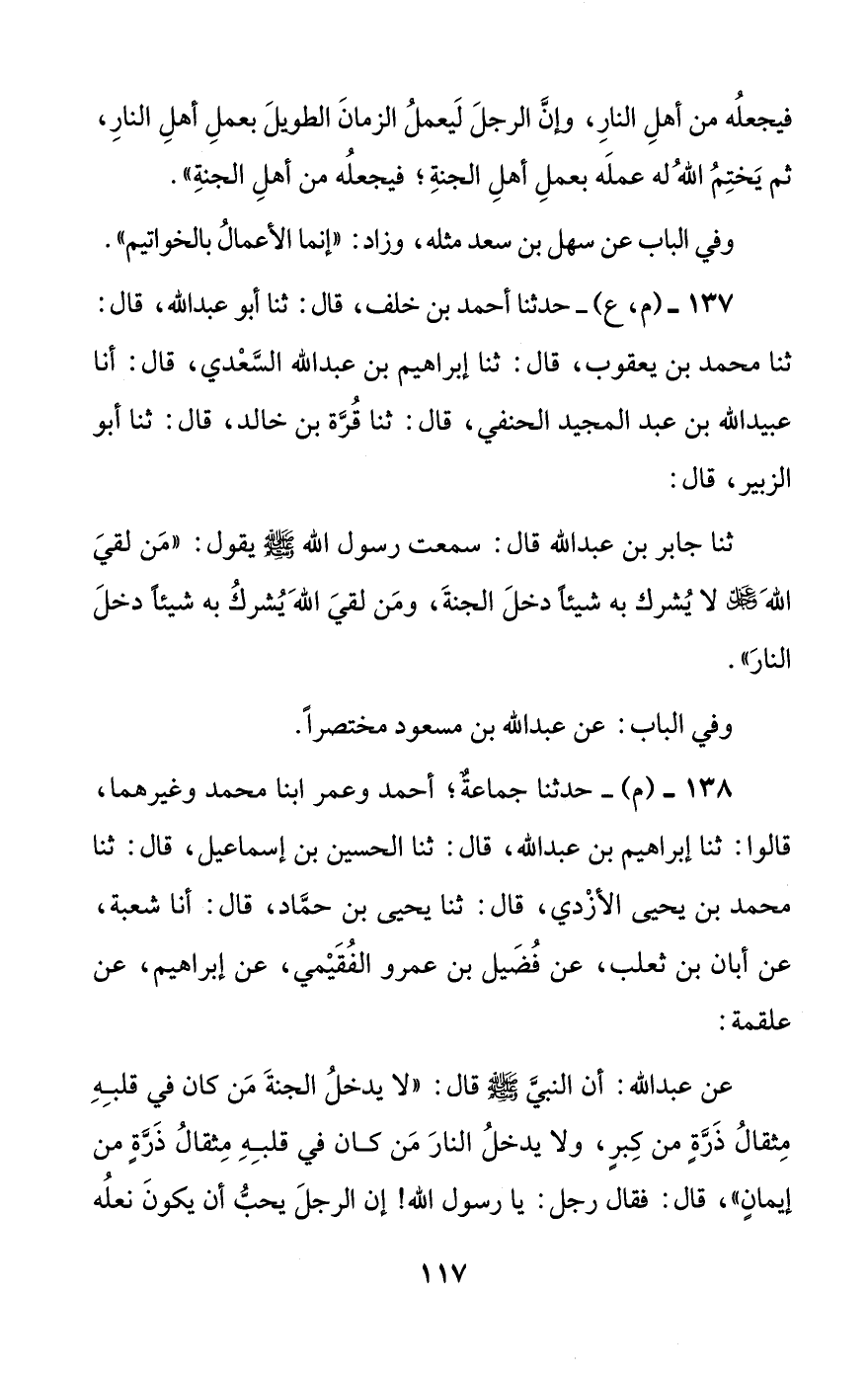137 - (م، ع) - حدثنا أحمد بن خلف، قال: ثنا أبو عبد الله، قال: ثنا محمد بن يعقوب، قال: ثنا إبراهيم بن عبد الله السعدي، قال: أنا عبيد الله بن عبد المجيد الحنفي، قال: ثنا قرة بن خالد، قال: ثنا أبو الزبير قال: