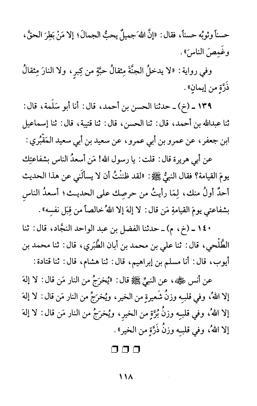 عن أنس رضي الله عنه، عن النبي صلى الله عليه وسلم قال: ((يخرج من النار من قال: لا إله إلا الله، وفي قلبه وزن شعيرة من الخير، ويخرج من النار من قال: لا إله إلا الله، وفي قلبه وزن برة من الخير، ويخرج من النار من قال: لا إله إلا الله، وفي قلبه وزن ذرة من الخير)).