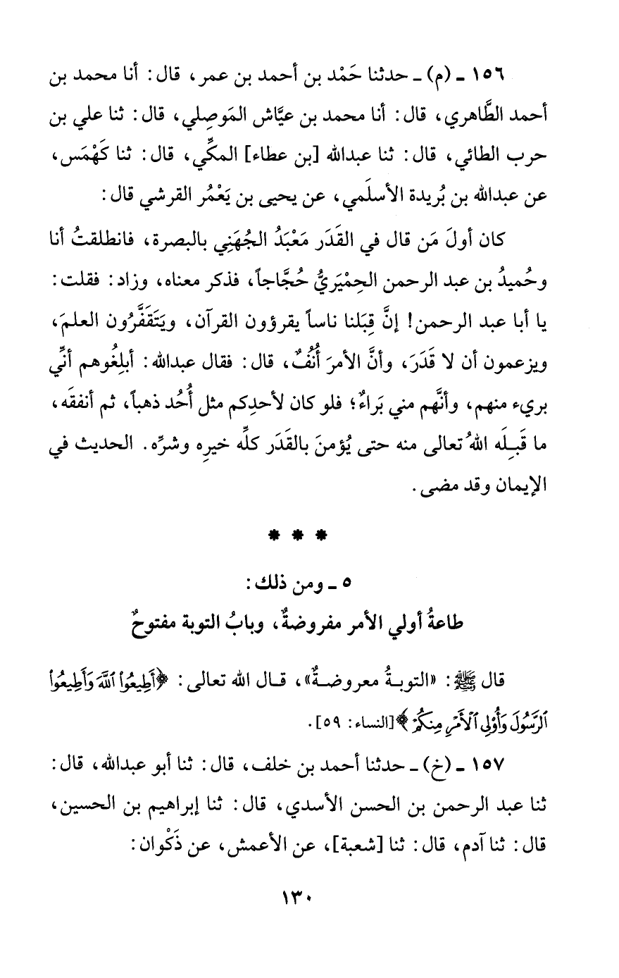 156 - (م) - حدثنا حمد بن أحمد بن عمر، قال: أنا محمد بن أحمد الطاهري، قال: أنا محمد بن عياش الموصلي، قال: ثنا علي بن حرب الطائي، قال: ثنا عبد الله [بن عطاء] المكي، قال: ثنا كهمس، عن عبد الله بن بريدة الأسلمي، عن يحيى بن يعمر القرشي قال: