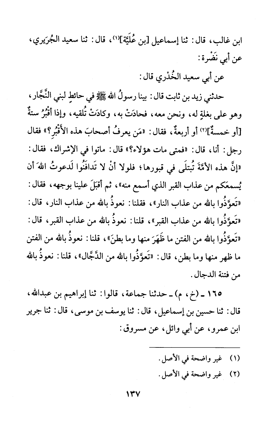 165 - (خ، م) - حدثنا جماعة، قالوا: ثنا إبراهيم بن عبد الله، قال: ثنا حسين بن إسماعيل، قال: ثنا يوسف بن موسى، قال: ثنا جرير ابن عمرو، عن أبي وائل، عن مسروق: #138# عن عائشة قالت: دخلت علي عجوزان من عجز يهود المدينة، فقالتا لي: إن أهل القبور يعذبون في قبورهم، قالت: فكذبتهما، ولم أنعم أن أصدقهما، قالت: فخرجتا، ودخل النبي صلى الله عليه وسلم، فقلت: يا رسول الله! إن عجوزين من عجز يهود المدينة دخلتا علي، فزعمتا أن أهل القبور يعذبون في قبورهم، فقال: ((صدقتا؛ إنهم ليعذبون عذابا تسمعه البهائم كلها))، قالت: فما رأيته بعد صلى صلاة إلا وتعوذ من عذاب القبر.
