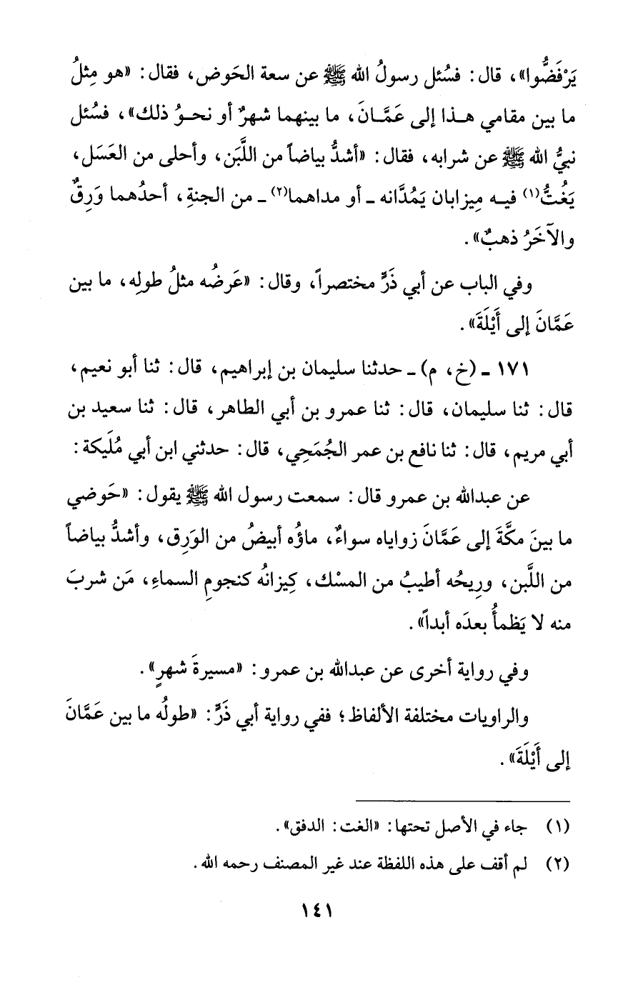 عن عبد الله بن عمرو قال: سمعت رسول الله صلى الله عليه وسلم يقول: ((حوضي ما بين مكة إلى عمان زواياه سواء، ماؤه أبيض من الورق، وأشد بياضا من اللبن، وريحه أطيب من المسك، كيزانه كنجوم السماء، من شرب منه لا يظمأ بعده أبدا)).