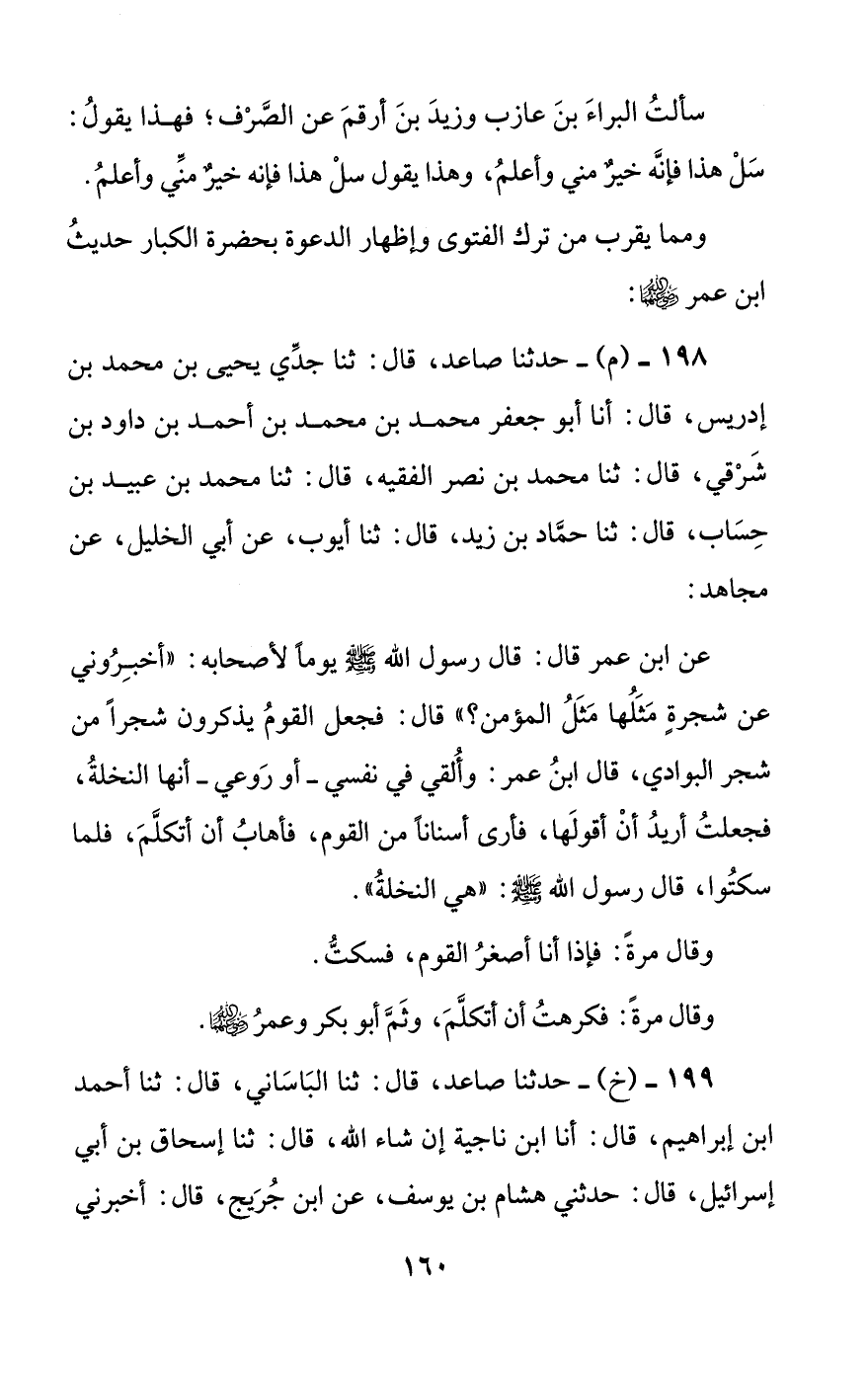 عن ابن عمر قال: قال رسول الله صلى الله عليه وسلم يوما لأصحابه: ((أخبروني عن شجرة مثلها مثل المؤمن؟)) قال: فجعل القوم يذكرون شجرا من شجر البوادي، قال ابن عمر: وألقي في نفسي –أو روعي- أنها النخلة، فجعلت أريد أن أقولها، فأرى أسنانا من القوم، فأهاب أن أتكلم، فلما سكتوا، قال رسول الله صلى الله عليه وسلم: ((هي النخلة)).