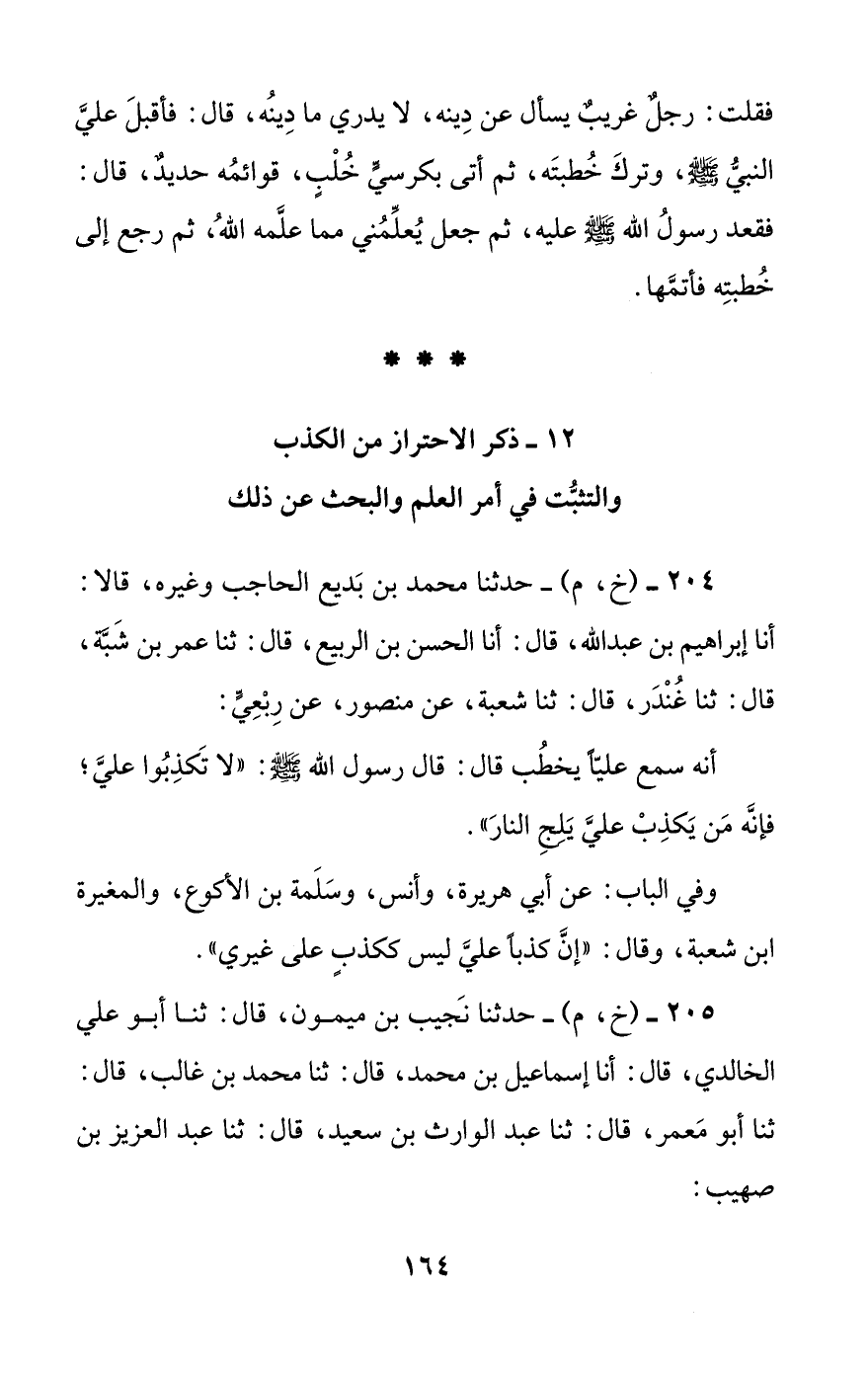 204 - (خ، م) - حدثنا محمد بن بديع الحاجب وغيره، قالا: أنا إبراهيم بن عبد الله، قال: أنا الحسن بن الربيع، قال: ثنا عمر بن شبة، قال: ثنا غندر، قال: ثنا شعبة، عن منصور، عن ربعي: