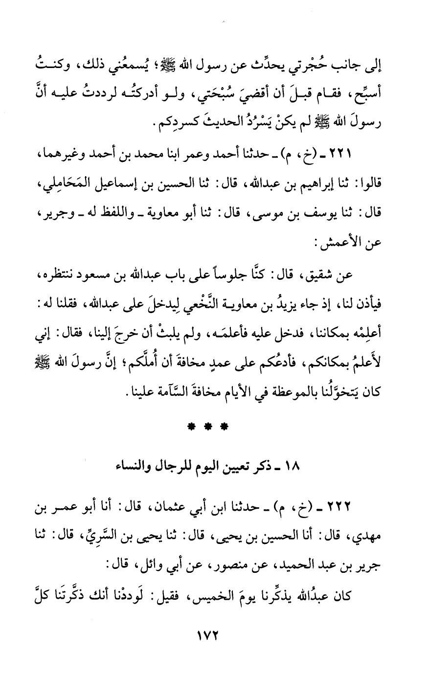 222 - (خ، م) - حدثنا ابن أبي عثمان، قال: أنا أبو عمر بن مهدي، قال: أنا الحسين بن يحيى، قال: ثنا يحيى بن السري، قال: ثنا جرير بن عبد الحميد، عن منصور، عن أبي وائل، قال: