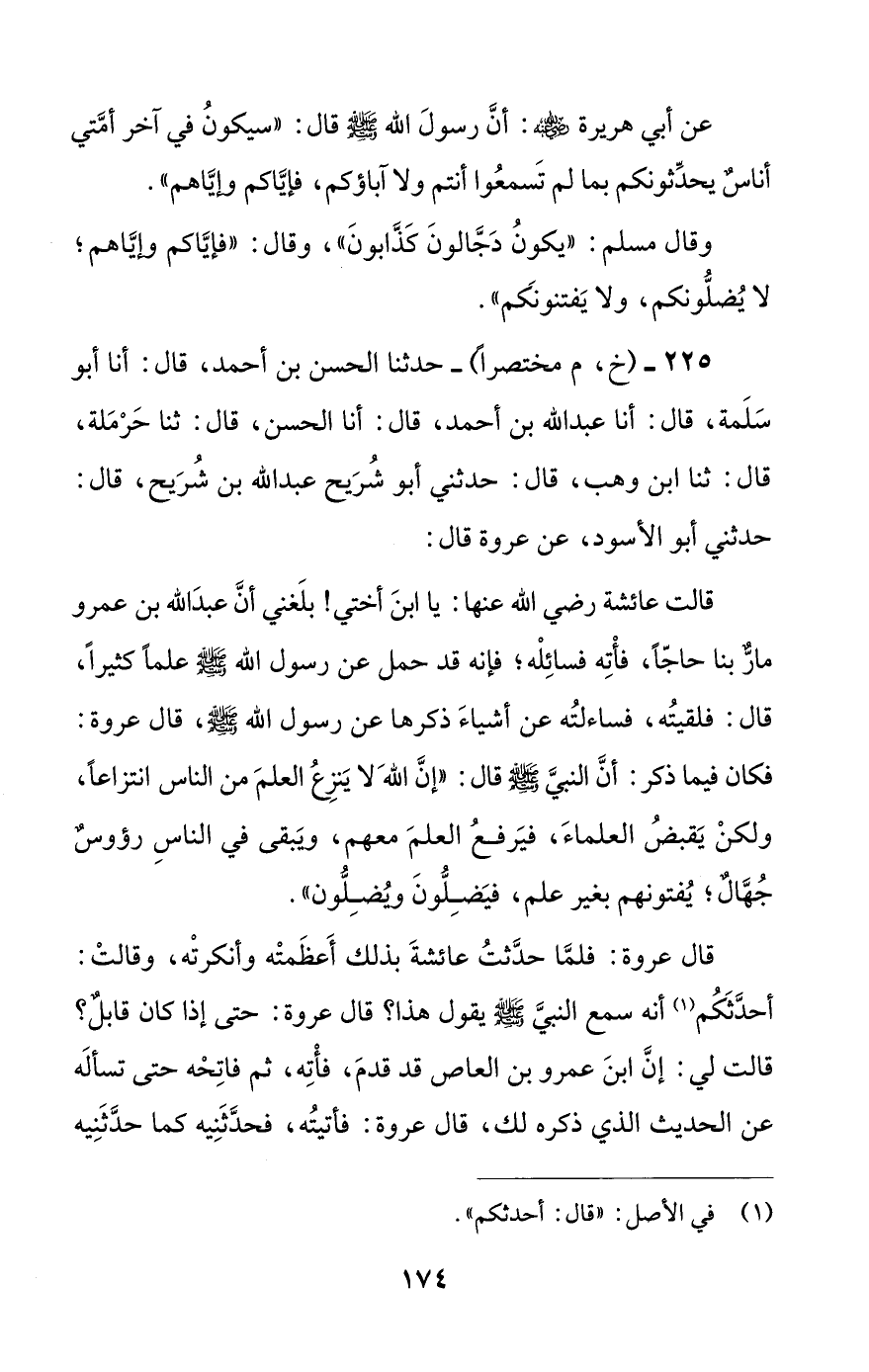قال عروة: فلما حدثت عائشة بذلك أعظمته وأنكرته، وقالت: أحدثكم أنه سمع النبي صلى الله عليه وسلم يقول هذا؟ قال عروة: حتى إذا كان قابل؟ قالت لي: إن ابن عمرو بن العاص قد قدم، فأته، ثم فاتحه حتى تسأله عن الحديث الذي ذكره لك، قال عروة: فأتيته، فحدثنيه كما حدثنيه #175# أول مرة، فلما أخبرتها بذلك قالت: ما أحسبه إلا قد صدق، ولم يزد فيه شيئا ولم [ينقص].