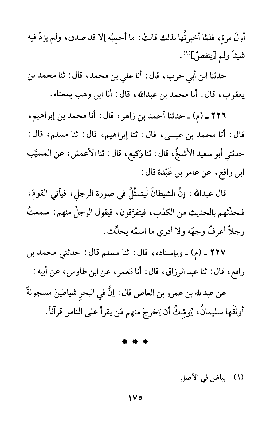 226 - (م) - حدثنا أحمد بن زاهر، قال: أنا محمد بن إبراهيم، قال: أنا محمد بن عيسى، قال: ثنا إبراهيم، قال: ثنا مسلم، قال: حدثني أبو سعيد الأشج، قال: ثنا وكيع، قال: ثنا الأعمش، عن المسيب بن رافع، عن عامر بن عبدة قال: