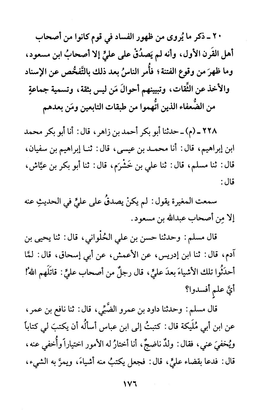 [20] ذكر ما يروى من ظهور الفساد في قوم كانوا من أصحاب أهل القرن الأول، وأنه لم يصدق على علي إلا أصحاب ابن مسعود، وما ظهر من وقوع الفتنة؛ فأمر الناس بعد ذلك بالتفحص عن الإسناد والأخذ عن الثقات، وتبيينهم أحوال من ليس بثقة، وتسمية جماعة من الضعفاء الذين اتهموا من طبقات التابعين ومن بعدهم