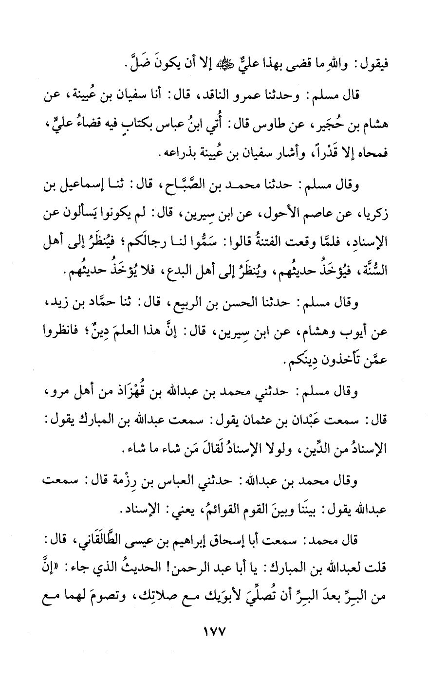 وقال مسلم: حدثني محمد بن عبد الله بن قهزاذ من أهل مرو، قال: سمعت عبدان بن عثمان يقول: سمعت عبد الله بن المبارك يقول: الإسناد من الدين، ولولا الإسناد لقال من شاء ما شاء.