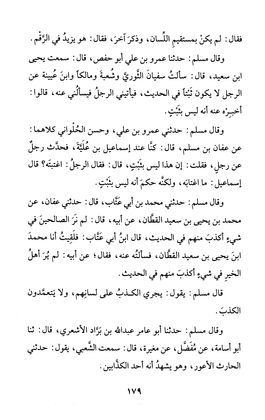 وقال مسلم: حدثني عمرو بن علي، وحسن الحلواني كلاهما: عن عفان بن مسلم، قال: كنا عند إسماعيل بن علية، فحدث رجل عن رجل، فقلت: إن هذا ليس بثبت، قال: فقال الرجل: اغتبته؟ قال إسماعيل: ما اغتابه، ولكنه حكم أنه ليس بثبت.