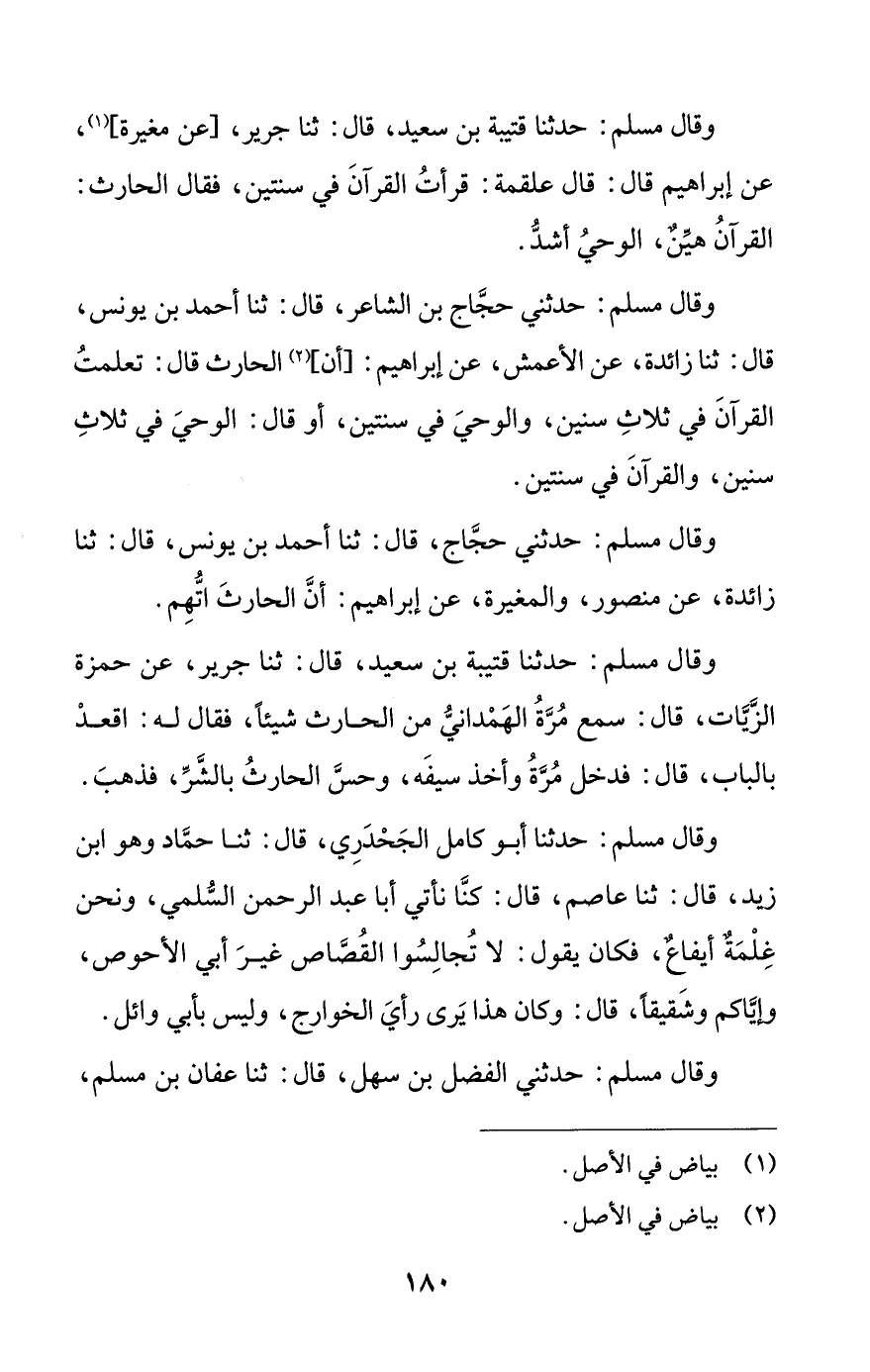 وقال مسلم: حدثنا قتيبة بن سعيد، قال: ثنا جرير، [عن مغيرة]، عن إبراهيم قال: قال علقمة: قرأت القرآن في سنتين، فقال الحارث: القرآن هين، الوحي أشد.