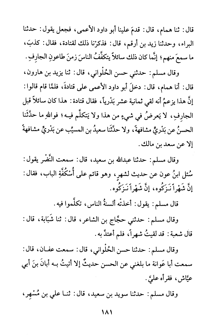 وقال مسلم: حدثنا سويد بن سعيد، قال: ثنا علي بن مسهر، #182# قال: سمعت أنا وحمزة الزيات من أبان بن أبي عياش نحوا من ألف حديث، قال علي: فلقيت حمزة، فأخبرني أنه رأى النبي صلى الله عليه وسلم في المنام، فعرض عليه ما سمع من أبان، فما عرف منها إلا شيئا يسيرا، خمسة أو ستة.
