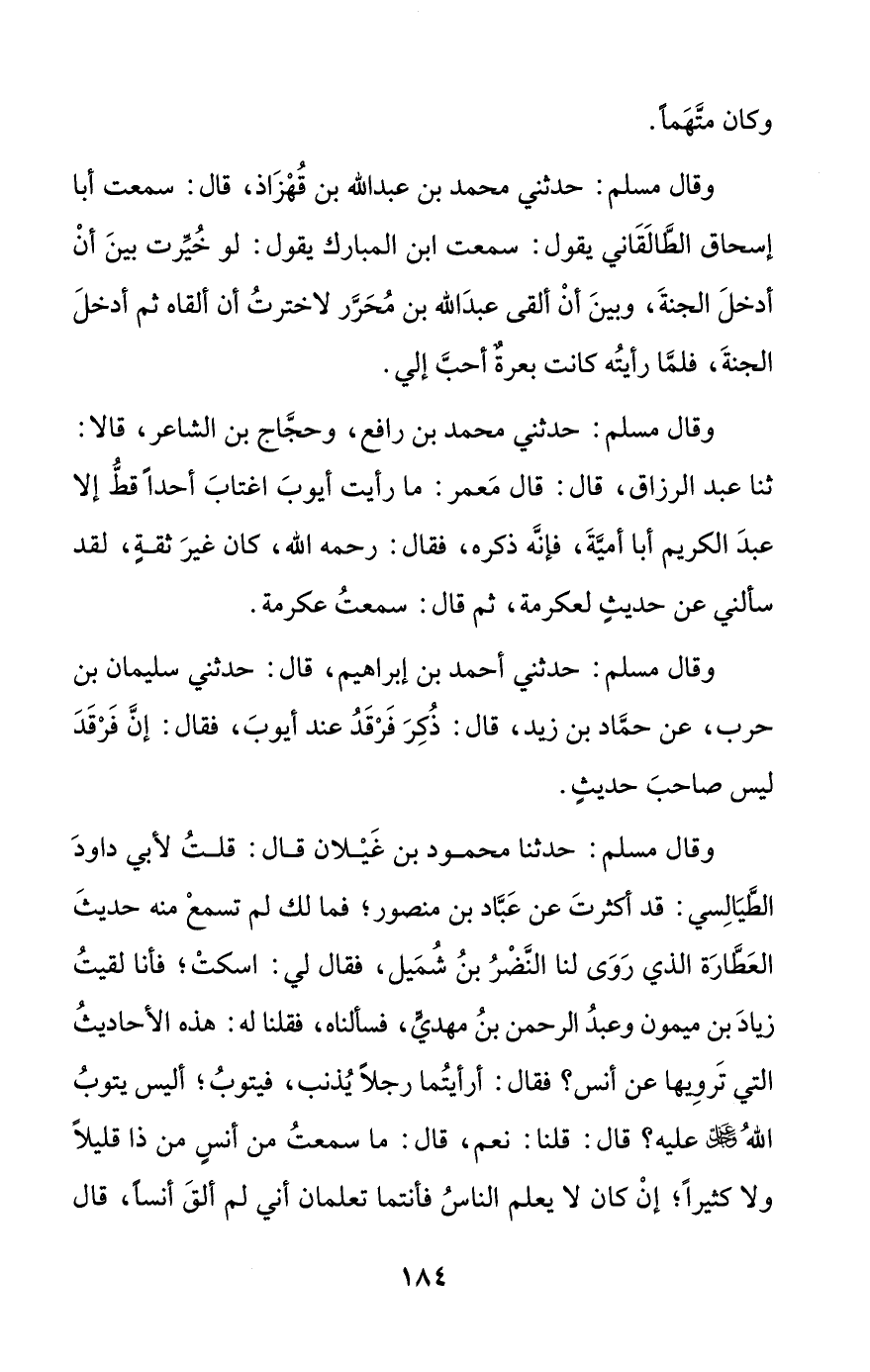 وقال مسلم: حدثنا محمود بن غيلان قال: قلت لأبي داود الطيالسي: قد أكثرت عن عباد بن منصور؛ فما لك لم تسمع منه حديث العطارة الذي روى لنا النضر بن شميل، فقال لي: اسكت؛ فأنا لقيت زياد بن ميمون وعبد الرحمن بن مهدي، فسألناه، فقلنا له: هذه الأحاديث التي ترويها عن أنس؟ فقال: أرأيتما رجلا يذنب، فيتوب؛ أليس يتوب الله عز وجل عليه؟ قال: قلنا: نعم، قال: ما سمعت من أنس من ذا قليلا ولا كثيرا؛ إن كان لا يعلم الناس فأنتما تعلمان أني لم ألق أنسا، قال #185# أبو داود: فبلغنا بعد أنه يروي، فأتيناه أنا وعبد الرحمن، فقال: أتوب، ثم بعد كان يحدث، فتركناه.