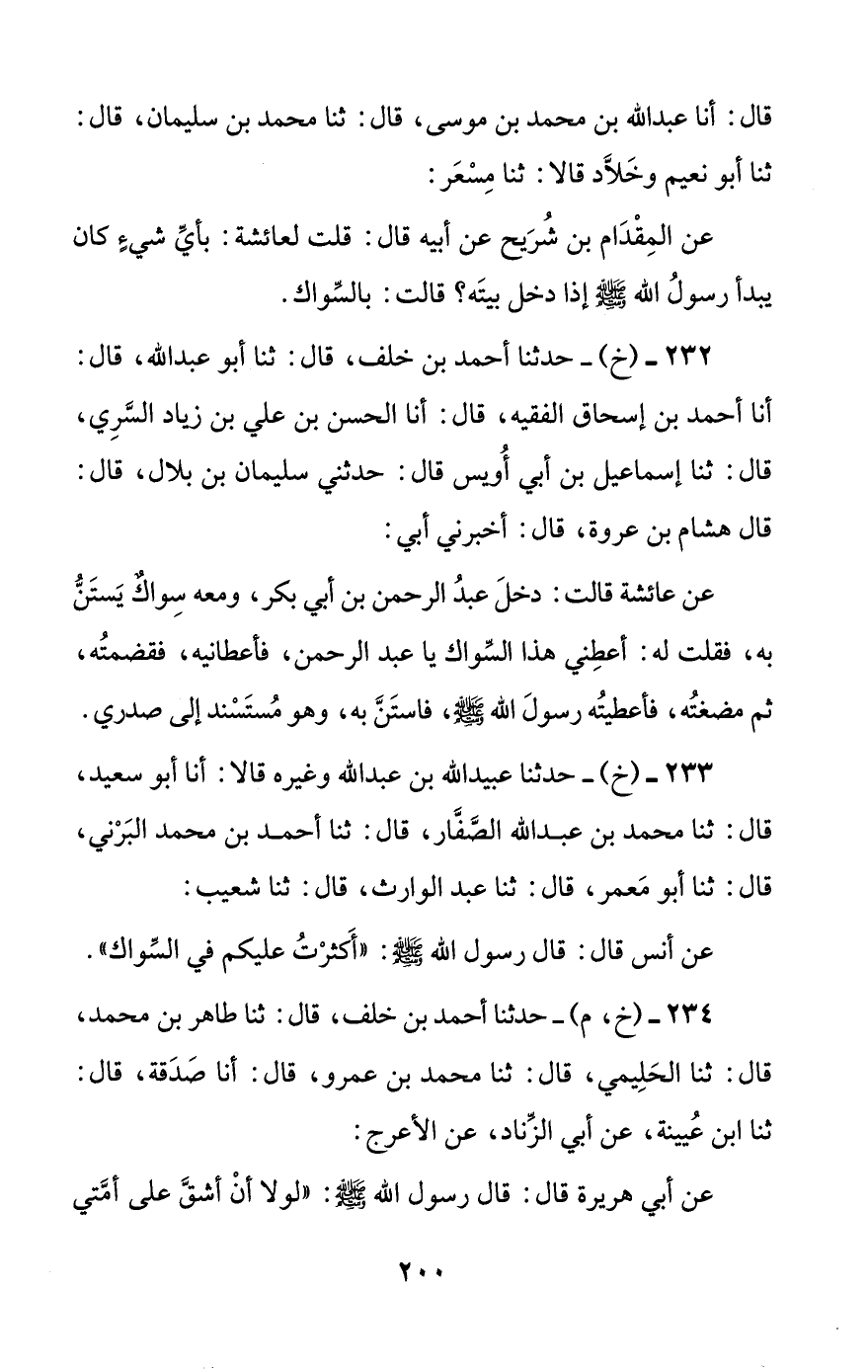 232 - (خ) - حدثنا أحمد بن خلف، قال: ثنا أبو عبد الله، قال: أنا أحمد بن إسحاق الفقيه، قال: أنا الحسن بن علي بن زياد السري، قال: ثنا إسماعيل بن أبي أويس قال: حدثني سليمان بن بلال، قال: قال هشام بن عروة، قال: أخبرني أبي: