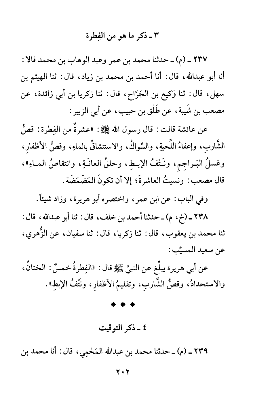 238 - (خ، م) - حدثنا أحمد بن خلف، قال: ثنا أبو عبد الله، قال: ثنا محمد بن يعقوب، قال: ثنا زكريا، قال: ثنا سفيان، عن الزهري، عن سعيد بن المسيب: