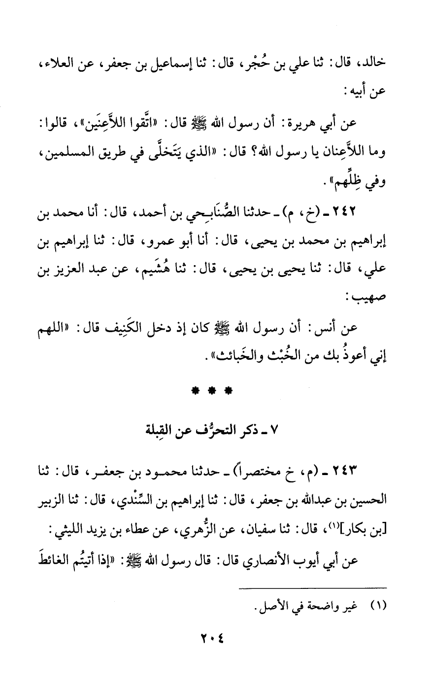 242 - (خ، م) - حدثنا الصنابحي بن أحمد، قال: أنا محمد بن إبراهيم بن محمد بن يحيى، قال: أنا أبو عمرو، قال: ثنا إبراهيم بن علي، قال: ثنا يحيى بن يحيى، قال: ثنا هشيم، عن عبد العزيز بن صهيب: