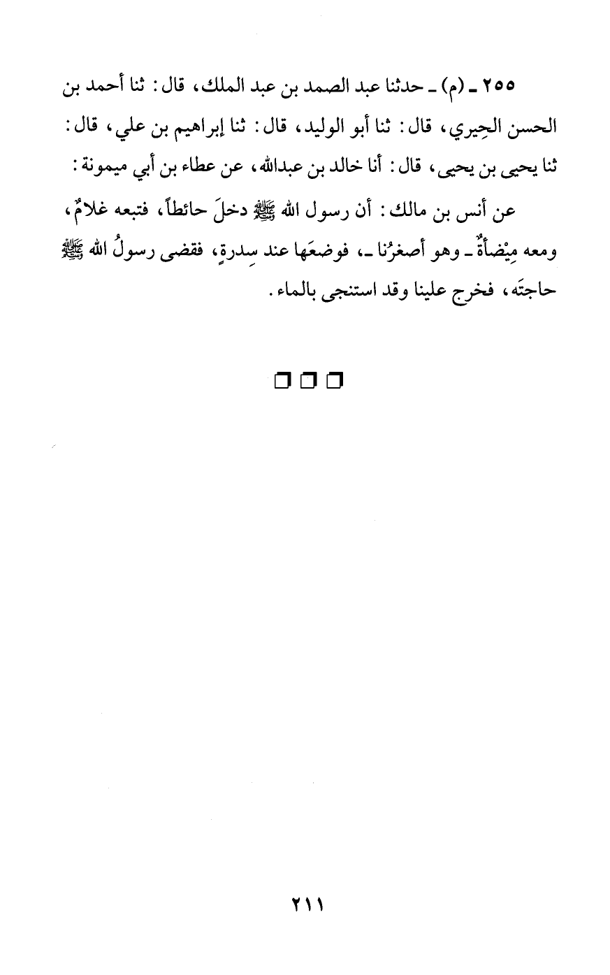 عن أنس بن مالك: أن رسول الله صلى الله عليه وسلم دخل حائطا، فتبعه غلام، ومعه ميضأة –وهو أصغرنا-، فوضعها عند سدرة، فقضى رسول الله صلى الله عليه وسلم حاجته، فخرج علينا وقد استنجى بالماء.