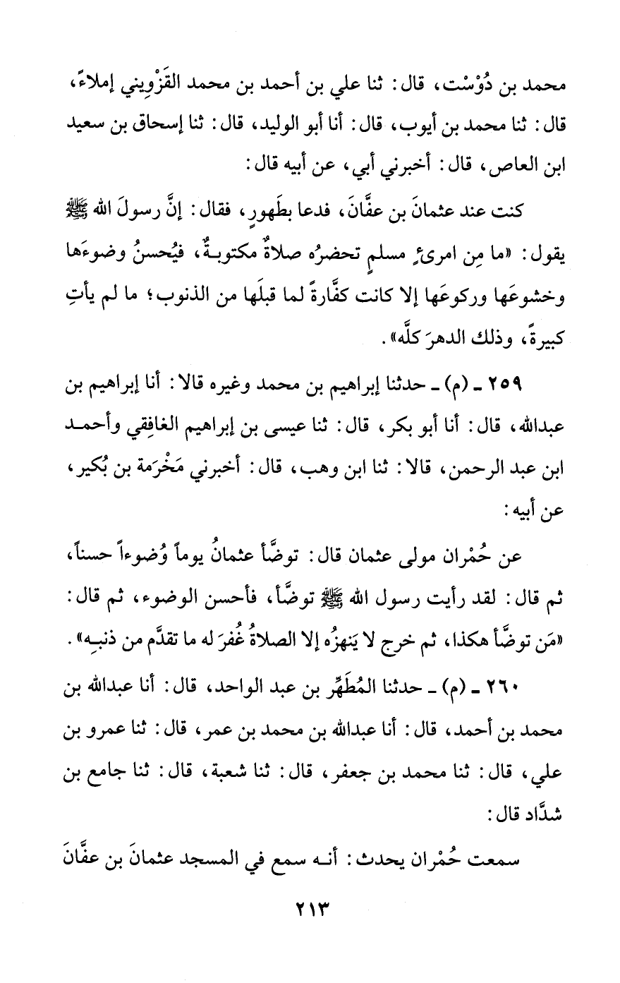 عن حمران مولى عثمان قال: توضأ عثمان يوما وضوءا حسنا، ثم قال: لقد رأيت رسول الله صلى الله عليه وسلم توضأ، فأحسن الوضوء، ثم قال: ((من توضأ هكذا، ثم خرج لا ينهزه إلا الصلاة غفر له ما تقدم من ذنبه)).