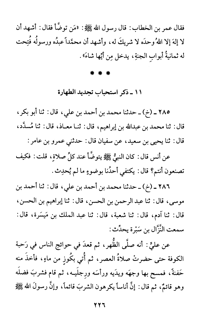 286 - (خ) - حدثنا محمد بن أحمد بن علي، قال: ثنا أحمد بن موسى، قال: ثنا عبد الرحمن بن الحسن، قال: ثنا إبراهيم بن الحسن، قال: ثنا آدم، قال: ثنا شعبة، قال: ثنا عبد الملك بن ميسرة، قال: سمعت النزال بن سبرة يحدث: