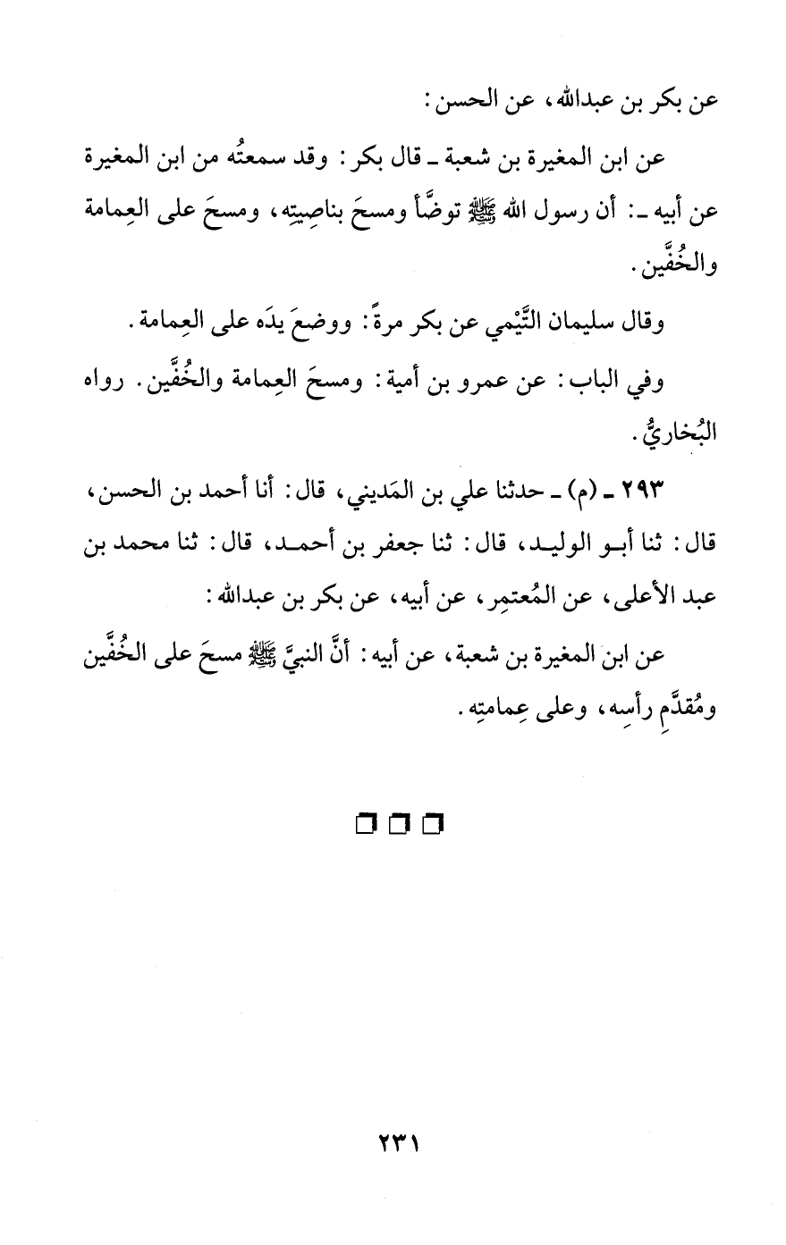عن ابن المغيرة بن شعبة، عن أبيه: أن النبي صلى الله عليه وسلم مسح على الخفين ومقدم رأسه، وعلى عمامته.