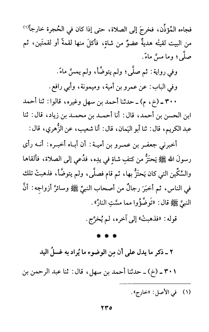 أخبرني جعفر بن عمرو بن أمية: أن أباه أخبره: أنه رأى رسول الله صلى الله عليه وسلم يحتز من كتف شاة في يده، فدعي إلى الصلاة، فألقاها والسكين التي كان يحتز بها، ثم قام فصلى، ولم يتوضأ، فذهبت تلك في الناس، ثم أخبر رجال من أصحاب النبي صلى الله عليه وسلم وسائر أزواجه: أن النبي صلى الله عليه وسلم قال: ((توضؤوا مما مست النار)).