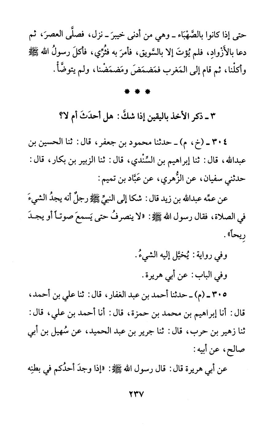 304 - (خ، م) - حدثنا محمود بن جعفر، قال: ثنا الحسين بن عبد الله، قال: ثنا إبراهيم بن السندي، قال: ثنا الزبير بن بكار، قال: حدثني سفيان، عن الزهري، عن عباد بن تميم: