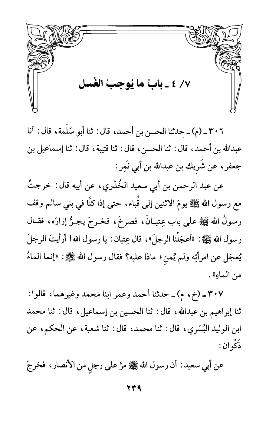 عن عبد الرحمن بن أبي سعيد الخدري، عن أبيه قال: خرجت مع رسول الله صلى الله عليه وسلم يوم الاثنين إلى قباء، حتى إذا كنا في بني سالم وقف رسول الله صلى الله عليه وسلم على باب عتبان، فصرخ، فخرج يجر إزاره، فقال رسول الله صلى الله عليه وسلم: ((أعجلنا الرجل))، قال عتبان: يا رسول الله! أرأيت الرجل يعجل عن امرأته ولم يمن؛ ماذا عليه؟ فقال رسول الله صلى الله عليه وسلم: ((إنما الماء من الماء)).