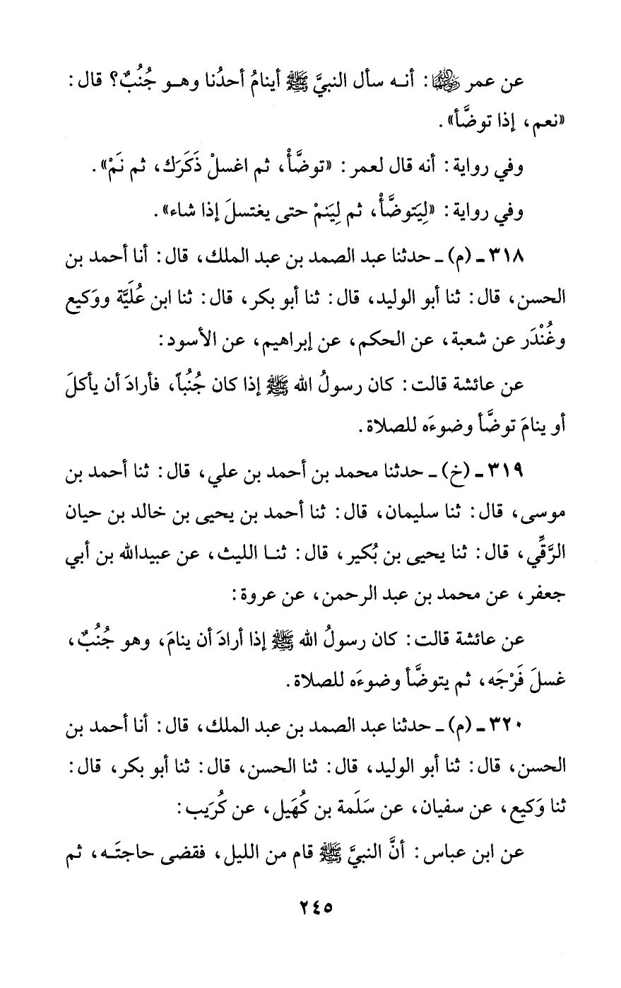 318 - (م) - حدثنا عبد الصمد بن عبد الملك، قال: أنا أحمد بن الحسن، قال: ثنا أبو الوليد، قال: ثنا أبو بكر، قال: ثنا ابن علية ووكيع وغندر عن شعبة، عن الحكم، عن إبراهيم، عن الأسود:
