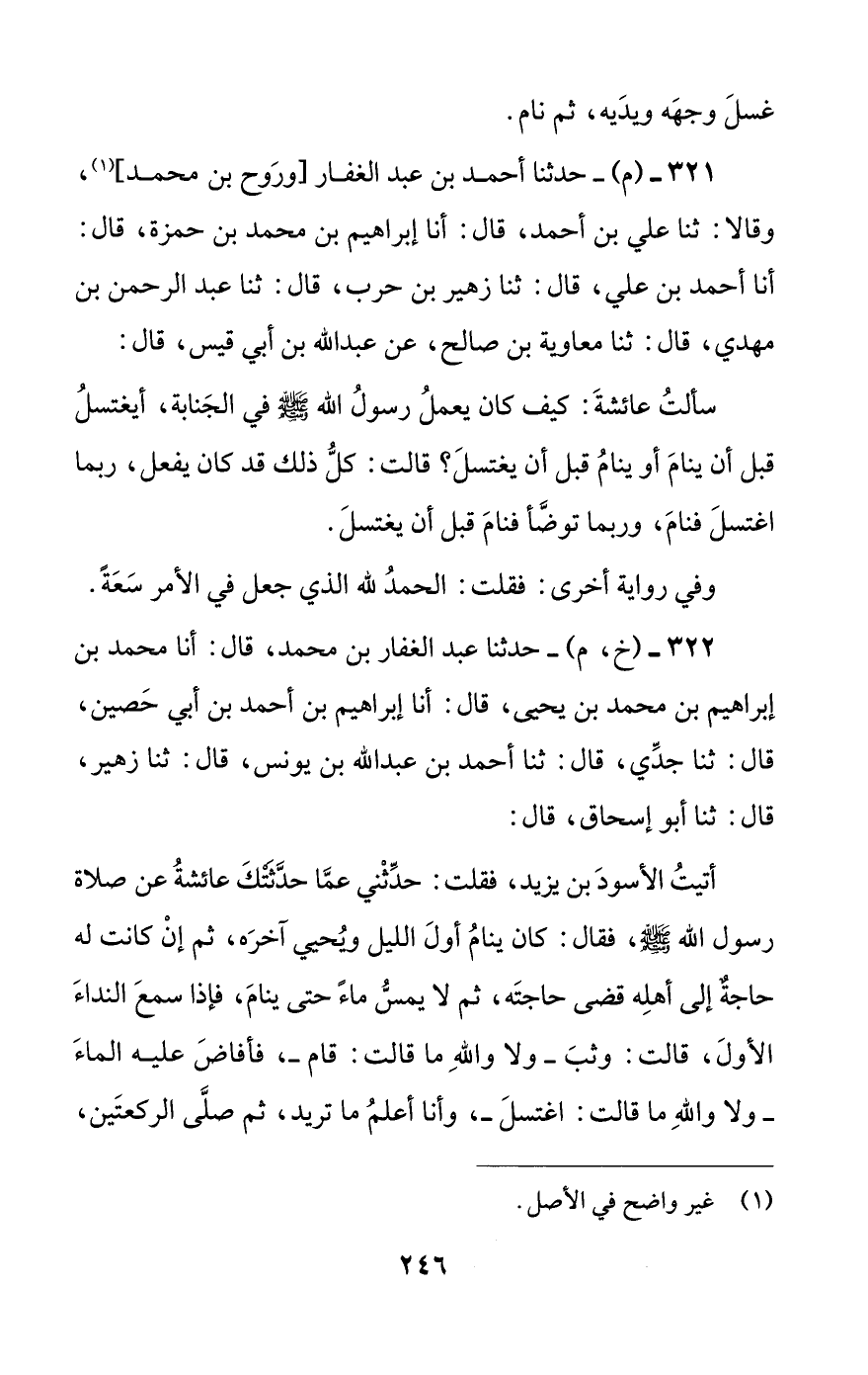 سألت عائشة: كيف كان يعمل رسول الله صلى الله عليه وسلم في الجنابة، أيغتسل قبل أن ينام أو ينام قبل أن يغتسل؟ قالت: كل ذلك قد كان يفعل، ربما اغتسل فنام، وربما توضأ فنام قبل أن يغتسل.