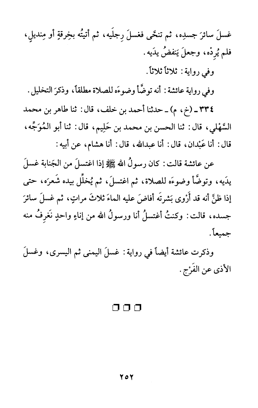 334 - (خ، م) - حدثنا أحمد بن خلف، قال: ثنا طاهر بن محمد السهلي، قال: ثنا الحسن بن محمد بن حليم، قال: ثنا أبو الموجه، قال: أنا عبدان، قال: أنا عبد الله، قال: أنا هشام، عن أبيه: