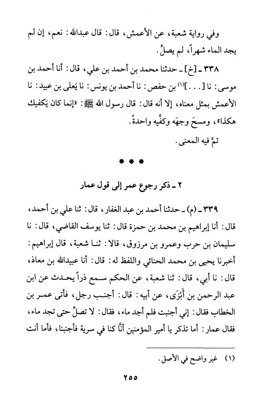339 - (م) - حدثنا أحمد بن عبد الغفار، قال: ثنا علي بن أحمد، قال: أنا إبراهيم بن محمد بن حمزة قال: ثنا يوسف القاضي، قال: نا سليمان بن حرب وعمرو بن مرزوق، قالا: ثنا شعبة، قال إبراهيم: أخبرنا يحيى بن محمد الحنائي واللفظ له: قال: أنا عبيد الله بن معاذ، قال: نا أبي، قال: ثنا شعبة، عن الحكم سمع ذرا يحدث عن ابن عبد الرحمن بن أبزى، عن أبيه: قال: أجنب رجل، فأتى عمر بن الخطاب فقال: إني أجنبت فلم أجد ماء، فقال: لا تصل حتى تجد ماء، فقال عمار: أما تذكر يا أمير المؤمنين أنا كنا في سرية فأجنبنا، فأما أنت #256# فلم تصل، وأما أنا فتمعكت بالأرض ثم صليت، فأتيت رسول الله صلى الله عليه وسلم فذكرت ذلك له، فقال: ((إنما يكفيك هذا))، ووصف شعبة أنه ضرب بيديه إلى الأرض ضربة، ثم نفخ فيهما، ثم دلك إحداهما بالأخرى، ثم مسح بهما وجهه، فقال عمر لعمار: انظر ما تقول. قال: إن شئت لما جعل الله لك علي من الحق ألا أحدث به أبدا.