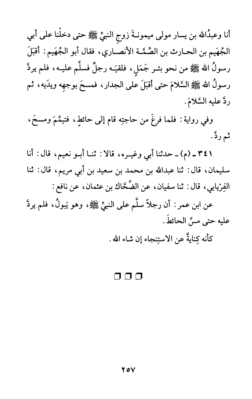 عن ابن عمر: أن رجلا سلم على النبي صلى الله عليه وسلم، وهو يبول، فلم يرد عليه حتى مس الحائط.