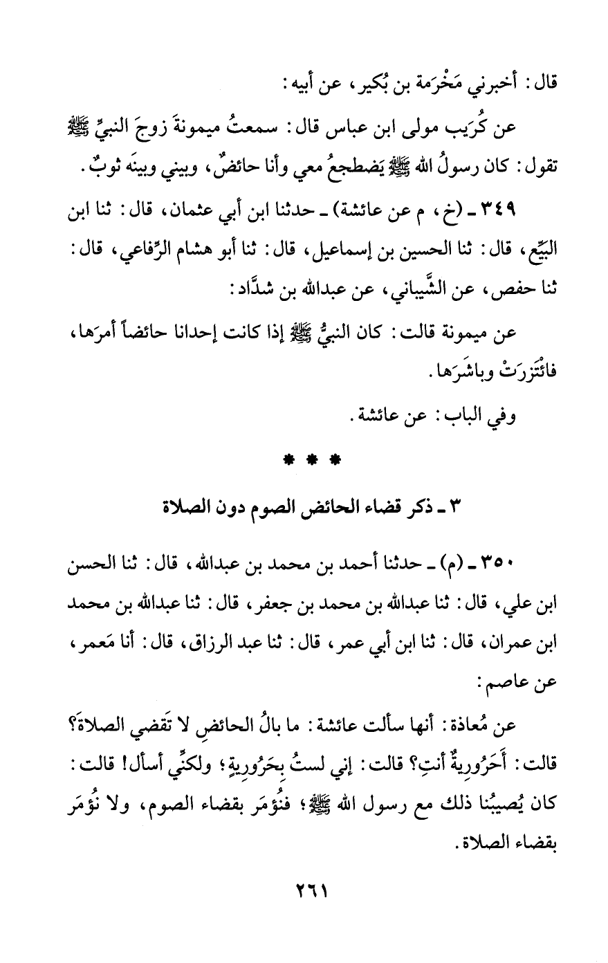 349 - (خ، م عن عائشة) - حدثنا ابن أبي عثمان، قال: ثنا ابن البيع، قال: ثنا الحسين بن إسماعيل، قال: ثنا أبو هشام الرفاعي، قال: ثنا حفص، عن الشيباني، عن عبد الله بن شداد:
