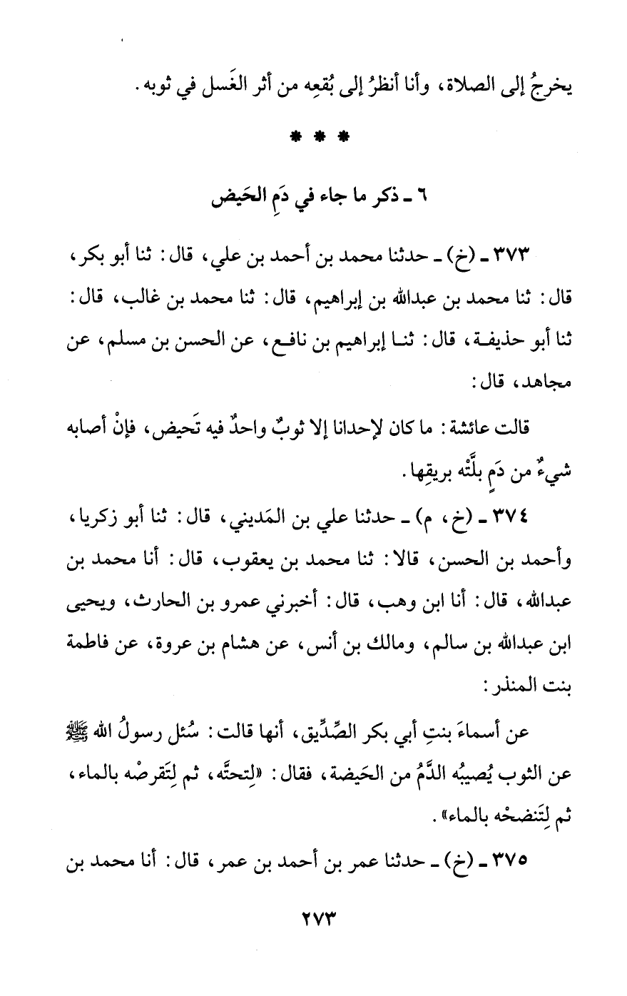 374 - (خ، م) - حدثنا علي بن المديني، قال: ثنا أبو زكريا، وأحمد بن الحسن، قالا: ثنا محمد بن يعقوب، قال: أنا محمد بن عبد الله، قال: أنا ابن وهب، قال: أخبرني عمرو بن الحارث، ويحيى بن عبد الله بن سالم، ومالك بن أنس، عن هشام بن عروة، عن فاطمة بنت المنذر: