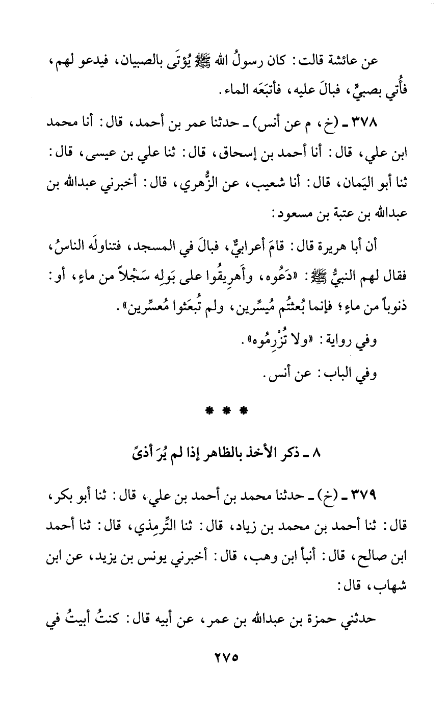 379 - (خ) - حدثنا محمد بن أحمد بن علي، قال: ثنا أبو بكر قال: ثنا أحمد بن محمد بن زياد، قال: ثنا الترمذي، قال: ثنا أحمد بن صالح، قال: أنبأ ابن وهب، قال: أخبرني يونس بن يزيد، عن ابن شهاب، قال:
