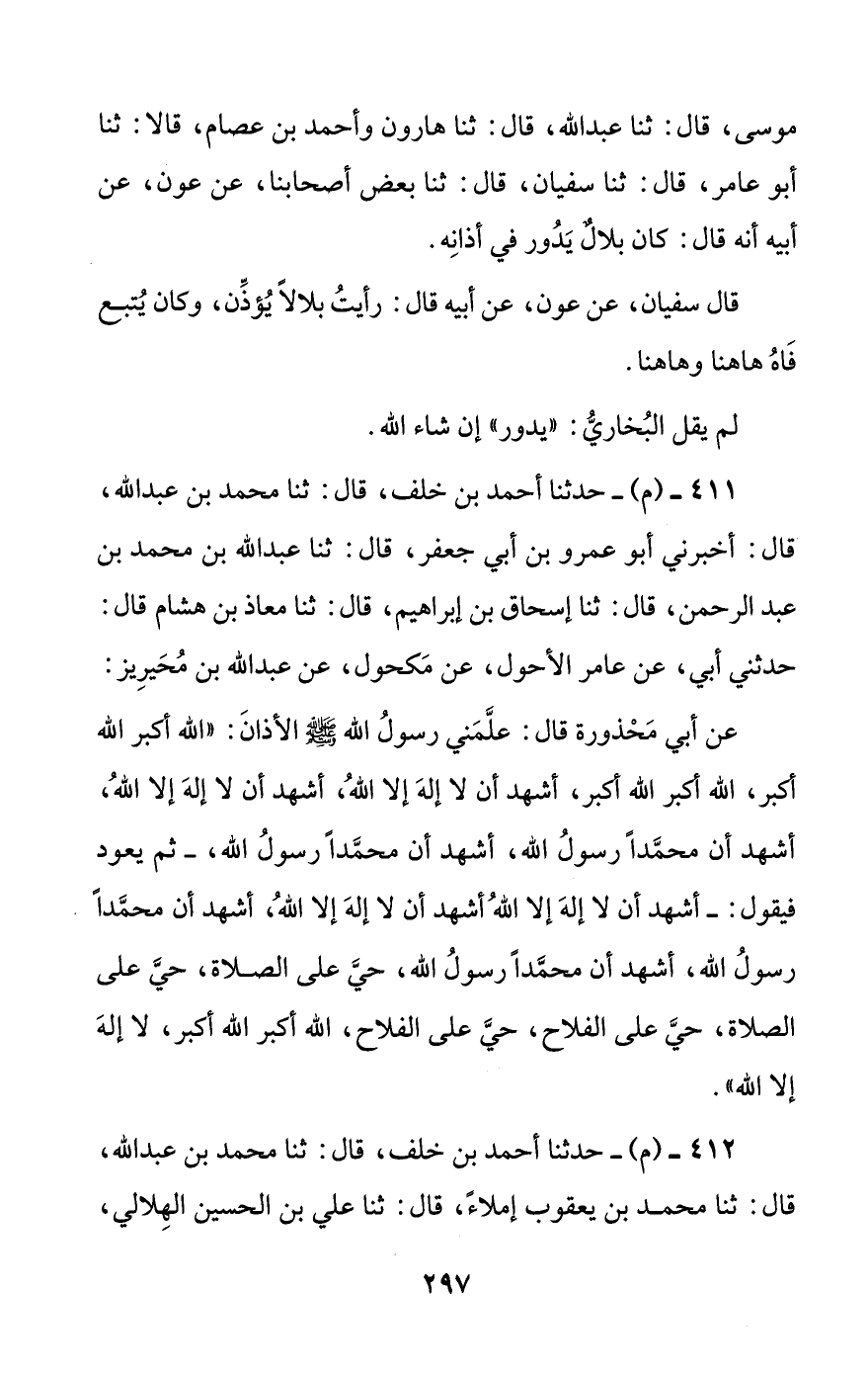عن أبي محذورة قال: علمني رسول الله صلى الله عليه وسلم الأذان: ((الله أكبر الله أكبر، الله أكبر الله أكبر، أشهد أن لا إله إلا الله، أشهد أن لا إله إلا الله، أشهد أن محمدا رسول الله، أشهد أن محمدا رسول الله، -ثم يعود فيقول-: أشهد أن لا إله إلا الله أشهد أن لا إله إلا الله، أشهد أن محمدا رسول الله، أشهد أن محمدا رسول الله، حي على الصلاة، حي على الصلاة، حي على الفلاح، حي على الفلاح، الله أكبر الله أكبر، لا إله إلا الله)).