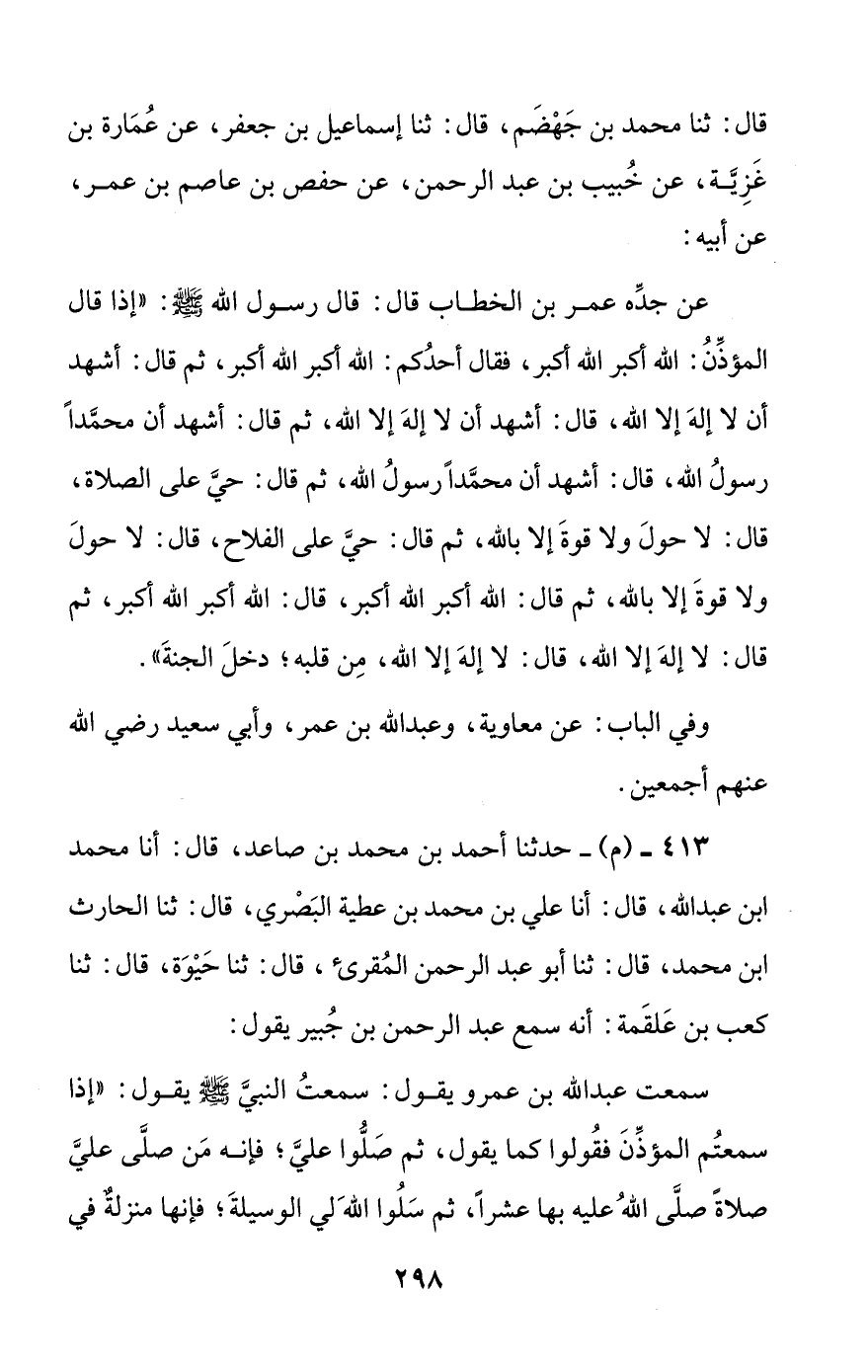 413 - (م) - حدثنا أحمد بن محمد بن صاعد، قال: أنا محمد بن عبد الله، قال: أنا علي بن محمد بن عطية البصري، قال: ثنا الحارث بن محمد، قال: ثنا أبو عبد الرحمن المقرئ، قال: ثنا حيوة، قال: ثنا كعب بن علقمة: أنه سمع عبد الرحمن بن جبير يقول: