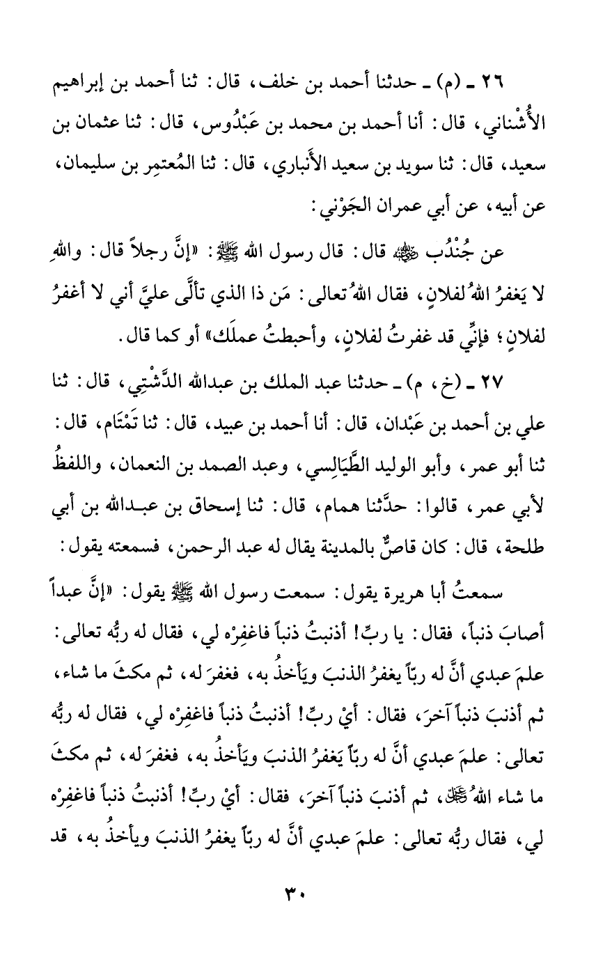26 - (م) - حدثنا أحمد بن خلف، قال: ثنا أحمد بن إبراهيم الأشناني، قال: أنا أحمد بن محمد بن عبدوس، قال: ثنا عثمان بن سعيد، قال: ثنا سويد بن سعيد الأنباري، قال: ثنا المعتمر بن سليمان، عن أبيه، عن أبي عمران الجوني: