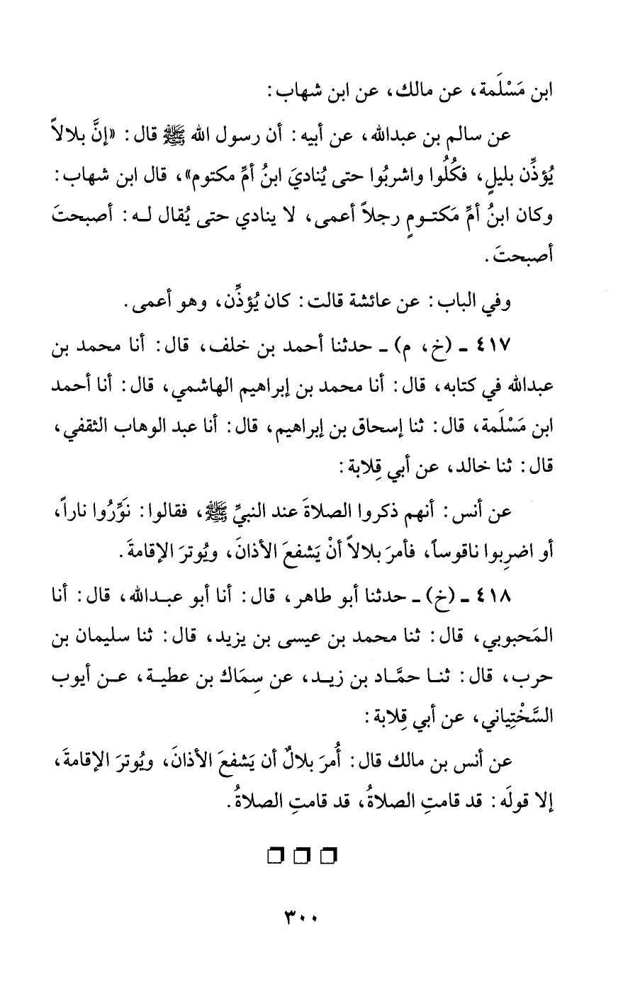 417 - (خ، م) - حدثنا أحمد بن خلف، قال: أنا محمد بن عبد الله في كتابه، قال: أنا محمد بن إبراهيم الهاشمي، قال: أنا أحمد بن مسلمة، قال: ثنا إسحاق بن إبراهيم، قال: أنا عبد الوهاب الثقفي، قال: ثنا خالد، عن أبي قلابة: